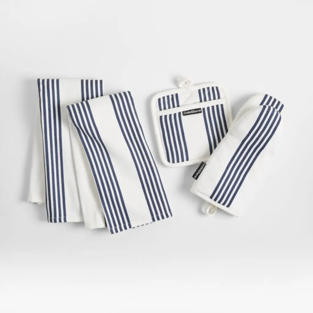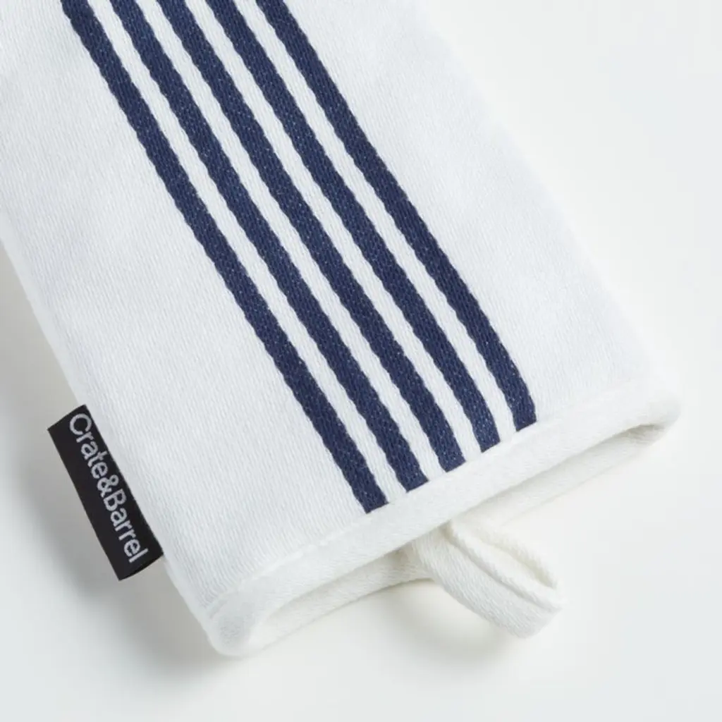 Simple kitchen essentials in organic cotton are striped thick and thin in bright white and deep indigo. Our oven mitt protects hands from hot pans, cleans up easily in the washing machine and gets softer with use and laundering. Pair the exclusive mitt with our other blue-and-white Cuisine Stripe textiles for a classic and coordinated kitchen.