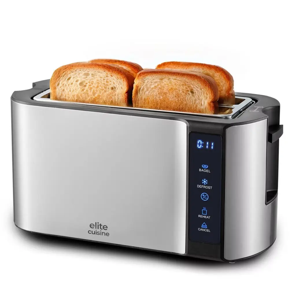 This 2-Slice Digital Toaster with Sandwich Cage offers six browning levels with dedicated Bagel, Defrost and Reheat functions, to make toast, using any bread. The LED digital display offers high visibility, and a countdown timer, so you know exactly when your food will be ready. Plus, with the included sandwich cage, you can make toasted sandwiches in minutes, and it is dishwasher safe for easy cleaning. Includes 13 recipes to get you creating yummy food, right out of the box!