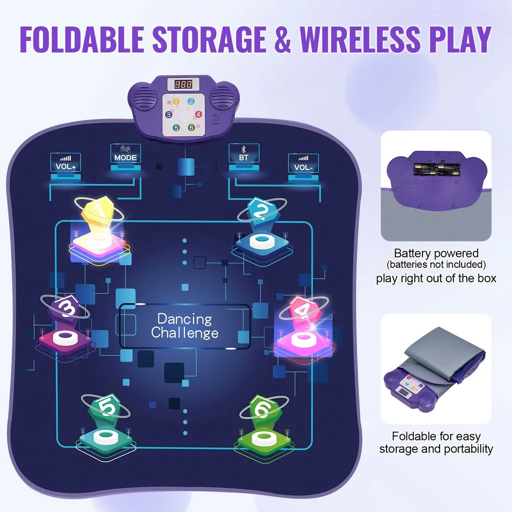 Diverse Gameplay: For 6-Button option: Unleash endless fun with 5 modes! Our dance mat features normal mode, 4-key mode, 6-key mode, memory mode, and electronic drum. Both 4-key mode and 6-key mode have 3 built-in levels. For 9-Button option: Unleash endless fun with 3 modes! Our dance mat features piano mode, dance mode (8 songs, 3 difficulty levels: easy, normal, hard), and challenge mode (8 exciting levels). You can proceed to the next level or stay at the current one after completing a challenge. For 8-Button option: Our dance mat features 2 modes (single player mode & two player PK mode) and 8 songs. Single player mode challenges with 8 levels, allowing you to choose whether to progress or repeat after each conquest, across 3 difficulty levels (easy, normal, hard). Two player PK mode spices things up with 3 gameplay variations (timed PK, unlimited PK, and memory mode). Switch it up anytime for a fresh dance experience! Advanced Bluetooth Function(for bluetooth option): Our electronic dance mat connects seamlessly to your smart device via Bluetooth, letting you groove to your favorite tunes straight from your personal playlist. Plus, control the volume right from your device for ultimate convenience and a hassle-free dance party experience. Durable and Non-Slip: Safe, sturdy, and slip-proof! Crafted from health-friendly vinyl, our electronic dance pad is BPA-free and odorless. The PE composite OPP surface stands the test of time, while the PEVA bottom grips the floor tight, keeping you steady and secure during every step. Easy to Store and Carry: Fold, go, and dance anywhere! Lightweight and soft, this dance pad folds neatly for easy storage, saving your space. With its wireless and portable design, it runs on 4 AA batteries (not included), so you can dance anytime, anywhere - no cords or hassle! LED arrows with light guidance make it easier to follow. A Unique Gift for Children: Wrapped in an exquisite gift box, our dancing mat is the ultimate surprise for Children's Day, Christmas, birthdays, or just because. It's more than a toy - it's an excellent early education tool to nurture your child's musicality, rhythm, and confidence! Package Content 1 x Dance Mat