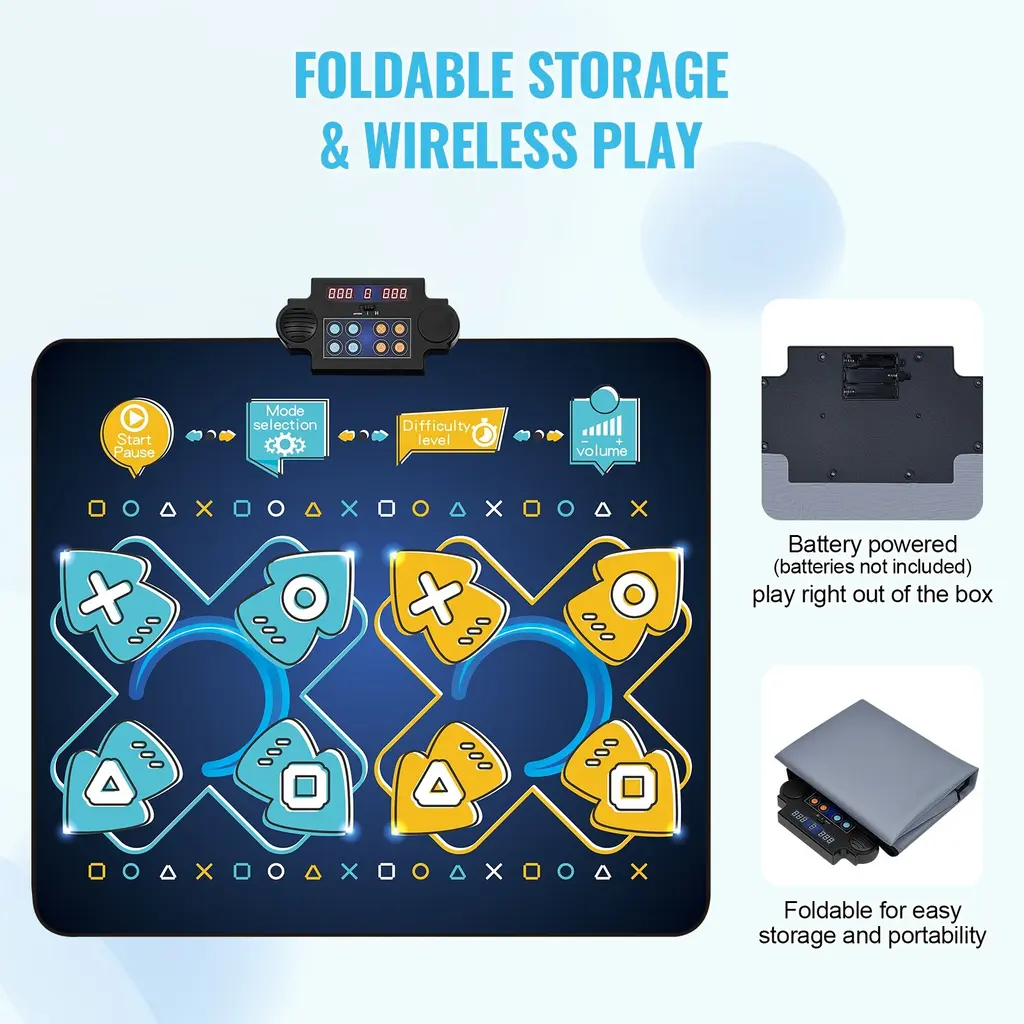Diverse Gameplay: For 6-Button option: Unleash endless fun with 5 modes! Our dance mat features normal mode, 4-key mode, 6-key mode, memory mode, and electronic drum. Both 4-key mode and 6-key mode have 3 built-in levels. For 9-Button option: Unleash endless fun with 3 modes! Our dance mat features piano mode, dance mode (8 songs, 3 difficulty levels: easy, normal, hard), and challenge mode (8 exciting levels). You can proceed to the next level or stay at the current one after completing a challenge. For 8-Button option: Our dance mat features 2 modes (single player mode & two player PK mode) and 8 songs. Single player mode challenges with 8 levels, allowing you to choose whether to progress or repeat after each conquest, across 3 difficulty levels (easy, normal, hard). Two player PK mode spices things up with 3 gameplay variations (timed PK, unlimited PK, and memory mode). Switch it up anytime for a fresh dance experience! Advanced Bluetooth Function(for bluetooth option): Our electronic dance mat connects seamlessly to your smart device via Bluetooth, letting you groove to your favorite tunes straight from your personal playlist. Plus, control the volume right from your device for ultimate convenience and a hassle-free dance party experience. Durable and Non-Slip: Safe, sturdy, and slip-proof! Crafted from health-friendly vinyl, our electronic dance pad is BPA-free and odorless. The PE composite OPP surface stands the test of time, while the PEVA bottom grips the floor tight, keeping you steady and secure during every step. Easy to Store and Carry: Fold, go, and dance anywhere! Lightweight and soft, this dance pad folds neatly for easy storage, saving your space. With its wireless and portable design, it runs on 4 AA batteries (not included), so you can dance anytime, anywhere - no cords or hassle! LED arrows with light guidance make it easier to follow. A Unique Gift for Children: Wrapped in an exquisite gift box, our dancing mat is the ultimate surprise for Children's Day, Christmas, birthdays, or just because. It's more than a toy - it's an excellent early education tool to nurture your child's musicality, rhythm, and confidence! Package Content 1 x Dance Mat