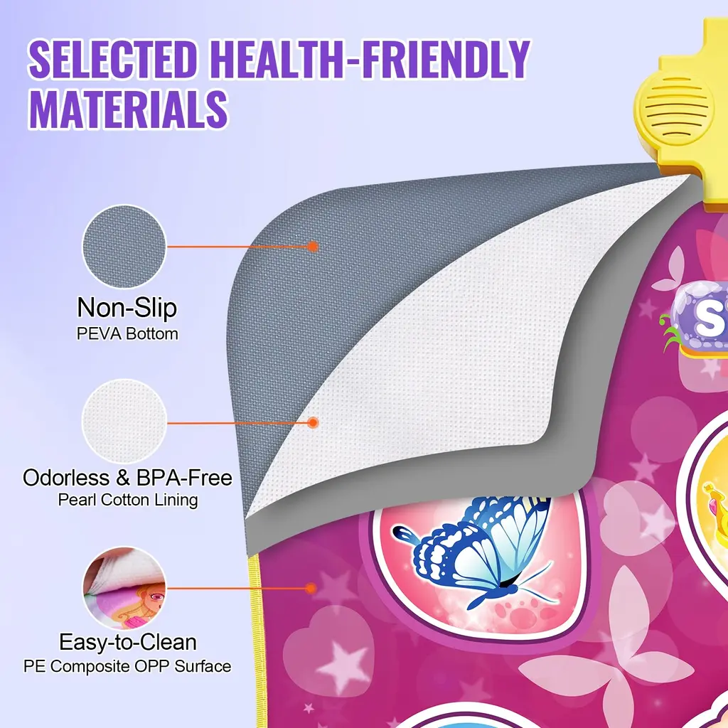 Diverse Gameplay: For 6-Button option: Unleash endless fun with 5 modes! Our dance mat features normal mode, 4-key mode, 6-key mode, memory mode, and electronic drum. Both 4-key mode and 6-key mode have 3 built-in levels. For 9-Button option: Unleash endless fun with 3 modes! Our dance mat features piano mode, dance mode (8 songs, 3 difficulty levels: easy, normal, hard), and challenge mode (8 exciting levels). You can proceed to the next level or stay at the current one after completing a challenge. For 8-Button option: Our dance mat features 2 modes (single player mode & two player PK mode) and 8 songs. Single player mode challenges with 8 levels, allowing you to choose whether to progress or repeat after each conquest, across 3 difficulty levels (easy, normal, hard). Two player PK mode spices things up with 3 gameplay variations (timed PK, unlimited PK, and memory mode). Switch it up anytime for a fresh dance experience! Advanced Bluetooth Function(for bluetooth option): Our electronic dance mat connects seamlessly to your smart device via Bluetooth, letting you groove to your favorite tunes straight from your personal playlist. Plus, control the volume right from your device for ultimate convenience and a hassle-free dance party experience. Durable and Non-Slip: Safe, sturdy, and slip-proof! Crafted from health-friendly vinyl, our electronic dance pad is BPA-free and odorless. The PE composite OPP surface stands the test of time, while the PEVA bottom grips the floor tight, keeping you steady and secure during every step. Easy to Store and Carry: Fold, go, and dance anywhere! Lightweight and soft, this dance pad folds neatly for easy storage, saving your space. With its wireless and portable design, it runs on 4 AA batteries (not included), so you can dance anytime, anywhere - no cords or hassle! LED arrows with light guidance make it easier to follow. A Unique Gift for Children: Wrapped in an exquisite gift box, our dancing mat is the ultimate surprise for Children's Day, Christmas, birthdays, or just because. It's more than a toy - it's an excellent early education tool to nurture your child's musicality, rhythm, and confidence! Package Content 1 x Dance Mat