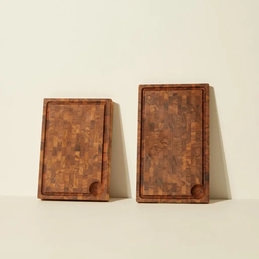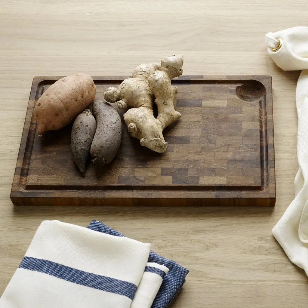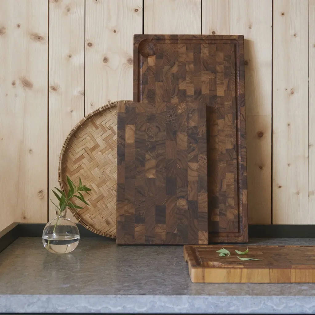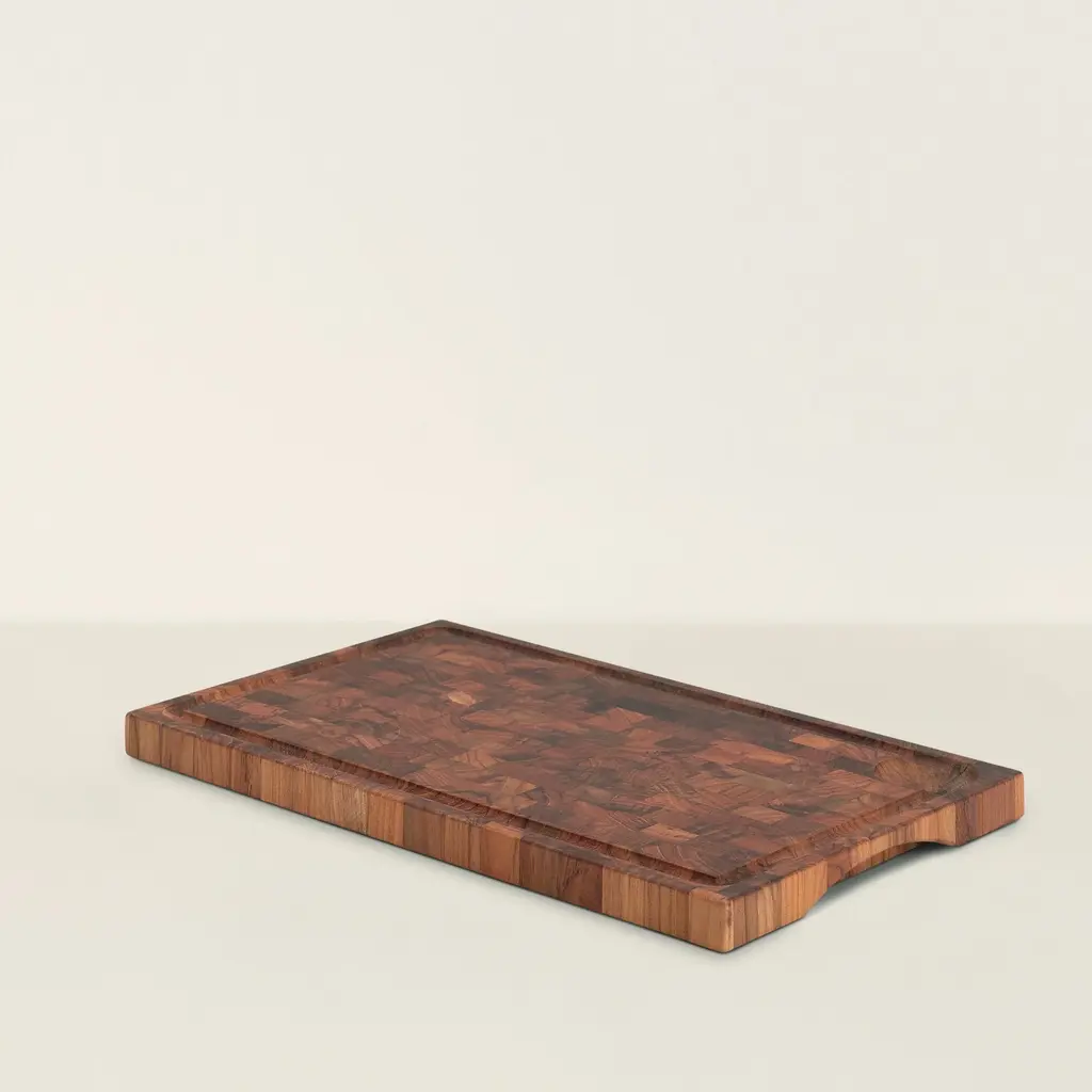 Thanks to a careful and detailed construction and design, this beautiful cutting board offers more than meets the eye. Crafted from teak end grain—a cross section of teak wood rather than a plank of it—the Dania Cutting Board displays a colorful mosaic of teak wood. Skagerak strategically chose FSC- certified teak as the material of choice: The durable wood is known for resisting moisture and germs. Gentle on your knives, your blades stay sharper longer thanks to the grain's excellent ability to absorb impact. The board's built-in grips make for an easy set-up, while a deep groove around the perimeter stops liquids and crumbs from spilling over.