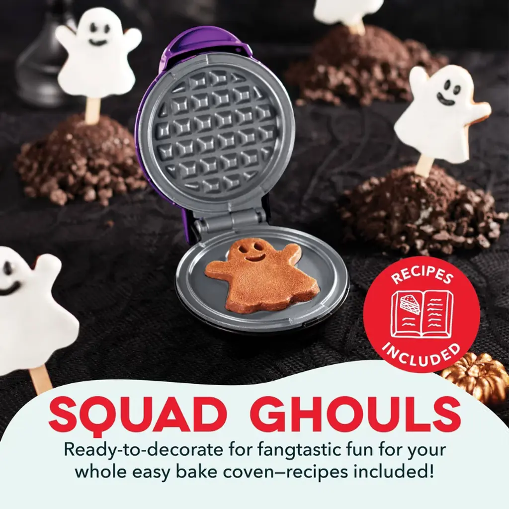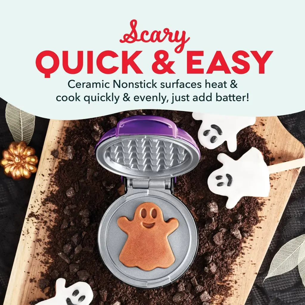Celebrate spooky season all year long with the Dash Ghost Mini Waffle Maker! Make ready to decorate 4” waffles for your boo and your whole easy bake coven. Perfect for a happy Halloween, festive family fun, parties, & bake sales. Surfaces heat & cook quickly & evenly for perfect waffles in a dash! Then, an Indicator Light lets you know it’s preheated and ready to start cooking! Our advanced CleanCoating Safe Ceramic Nonstick Coating is naturally slick for easy release and quick cleanup. Recipes included for fangtastic fun and devilish deliciousness! "