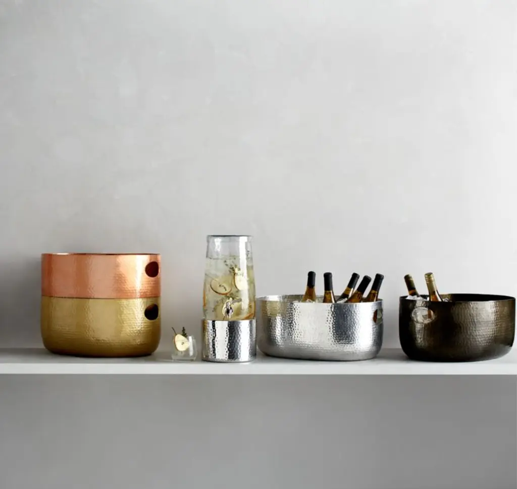 Our Dax drink dispenser sits pretty on a handsome, hand-hammered aluminum stand, elevating the dispenser so glasses can fit under the spigot. Taking its cue from our Dax barware, the handcrafted drink dispenser gives a frosty look to fruity punches and herb-infused iced tea with its hammered-like texture. A spigot ensures a perfect pour every time, and when it's time to add more liquid or ice, simply lift the lid.