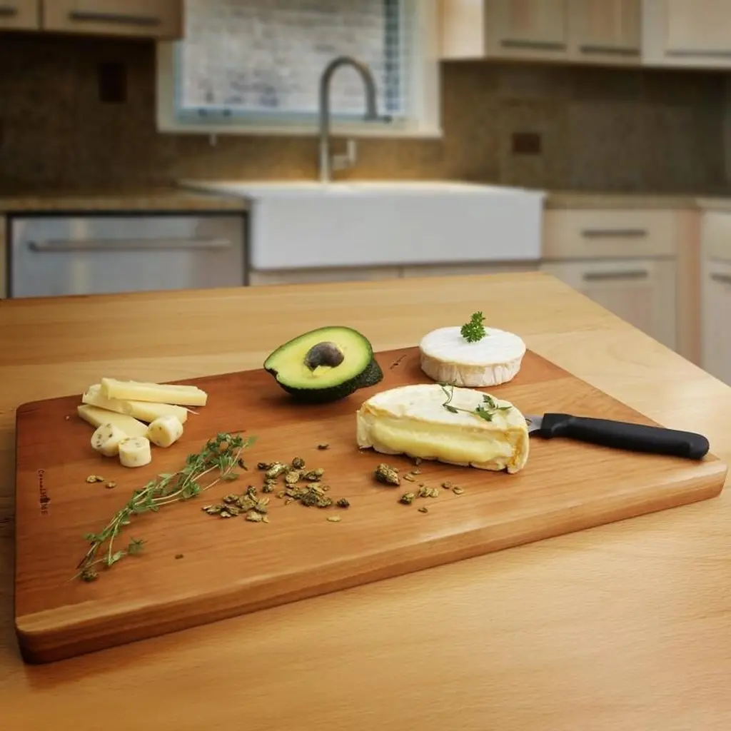 Made from responsibly harvested American Hardwood, this cutting board allows the natural grain of the wood to stand out and will last long to be treasured for years in use on countertops and serving tables. This board can be used on both sides. The juice groove on one side presents a convenient environment for various meats and moist ingredients but flip the board and the flat side presents a perfect surface to present cheese, bread, and other hors d'oeuvres. Natural wood boards allow knives to keep their edge better while withstanding heavy use in any kitchen. Features: