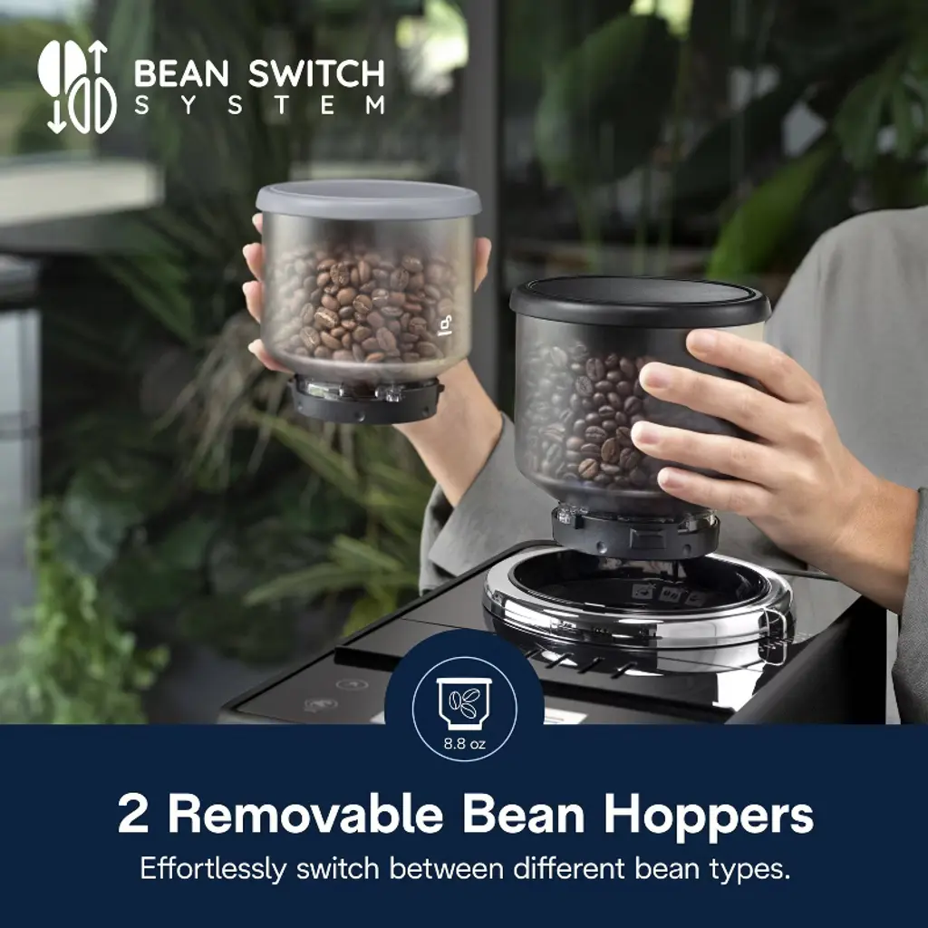 Your favorite drinks are just a touch away—grind, dose, brew and froth in style with the Rivelia fully automatic espresso machine. This compact, award-winning design invites you to easily and intuitively switch up your daily coffee routine with ease and customization—from instantly swapping between bean types, to tailoring your brew to your bean, to learning and storing your individual preferences for you and three other users for the perfect drink, to custom colors to bring out your personality in the kitchen. It all starts with the innovative Bean Switch System: interchangeable bean hoppers that enable you to explore worlds of coffee flavor by swapping one fresh bean type for another without missing a beat. Go from a robust dark roast in the morning to a light decaf latte or rich espresso martini later in the day. Then Rivelia’s Bean Adapt Technology becomes your personal coffee expert—helping you set and save each unique bean’s ideal grind, dose and temperature to ensure the perfect extraction every time. Guesswork: gone. Options: infinite. Rivelia’s fully automatic LatteCrema Hot System takes all the fuss out of frothing. There’s no messy steam wand or complicated manual control. With just the touch of a button, you can easily froth milk or plant-based alternatives directly into your cup to create steamy, creamy lattes, cappuccinos and other specialty drinks with ease. And with four distinct user profiles, smart menus that update throughout the day based on your coffee routine and a 3.5-inch color touch display featuring an expansive menu of hot and cold recipes, coffeemaking at home is transformed from a daily to-do to a delightful moment that can match any mood, with any bean, any drink, at any time of day. With the Rivelia and its modern minimalist design that’s more décor than appliance, the power to switch and personalize your coffee experience at home is at your fingertips.