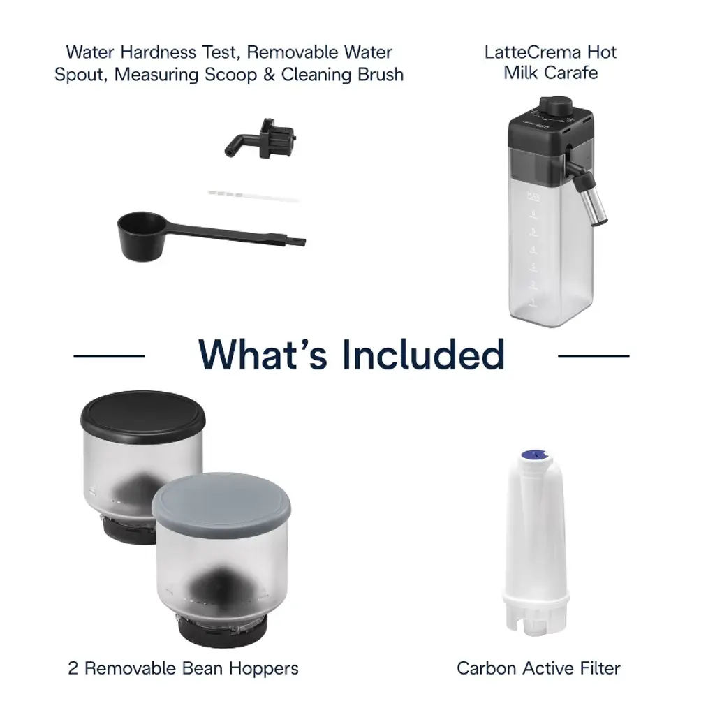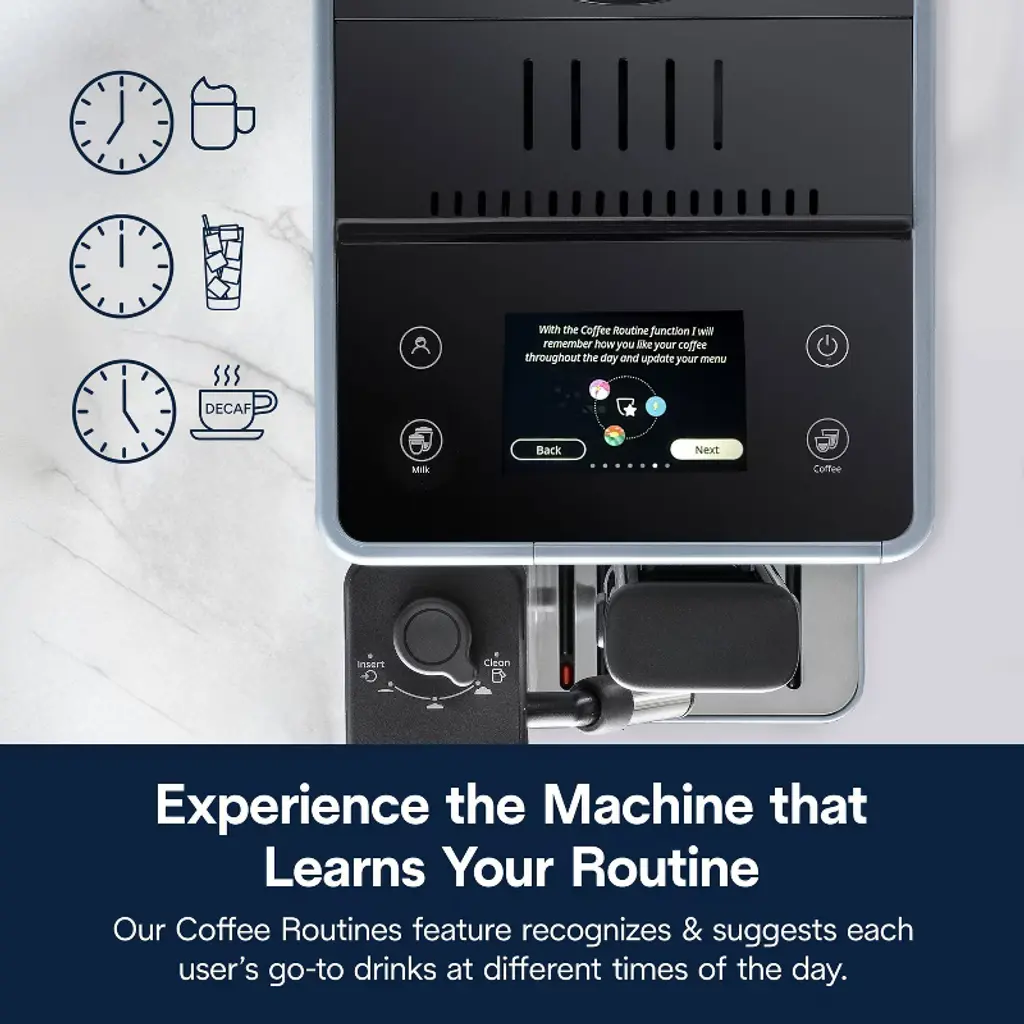 Your favorite drinks are just a touch away—grind, dose, brew and froth in style with the Rivelia fully automatic espresso machine. This compact, award-winning design invites you to easily and intuitively switch up your daily coffee routine with ease and customization—from instantly swapping between bean types, to tailoring your brew to your bean, to learning and storing your individual preferences for you and three other users for the perfect drink, to custom colors to bring out your personality in the kitchen. It all starts with the innovative Bean Switch System: interchangeable bean hoppers that enable you to explore worlds of coffee flavor by swapping one fresh bean type for another without missing a beat. Go from a robust dark roast in the morning to a light decaf latte or rich espresso martini later in the day. Then Rivelia’s Bean Adapt Technology becomes your personal coffee expert—helping you set and save each unique bean’s ideal grind, dose and temperature to ensure the perfect extraction every time. Guesswork: gone. Options: infinite. Rivelia’s fully automatic LatteCrema Hot System takes all the fuss out of frothing. There’s no messy steam wand or complicated manual control. With just the touch of a button, you can easily froth milk or plant-based alternatives directly into your cup to create steamy, creamy lattes, cappuccinos and other specialty drinks with ease. And with four distinct user profiles, smart menus that update throughout the day based on your coffee routine and a 3.5-inch color touch display featuring an expansive menu of hot and cold recipes, coffeemaking at home is transformed from a daily to-do to a delightful moment that can match any mood, with any bean, any drink, at any time of day. With the Rivelia and its modern minimalist design that’s more décor than appliance, the power to switch and personalize your coffee experience at home is at your fingertips.