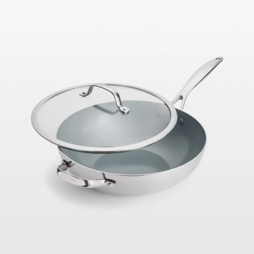Inspired by chefs and designed for home kitchens, these professional, stainless-steel fry pans are the secret to crispy chicken cutlets, caramelized steaks, and delicious stir-fries. The 8- and 11-inch fry pans are ideal for fried eggs while the 12.5-inch fry pan has a perfect-fit lid for tender breakfast potatoes. It’s convenient helper handle makes for easy maneuvering.The durable 5-ply construction boasts optimal heat distribution, conduction, and retention. This guarantees even cooking from rim to rim, for perfect pancakes, browned meats, and seared salmon. Don’t worry about cooking at high temperatures – the signature flat base stability prevents warping.Enjoy chef-friendly features like stay-cool, 18/10 stainless-steel handles. Their secure rivets will have you flipping omelettes with confidence. While the perfect pouring edge ensures no-mess cooking and serving.