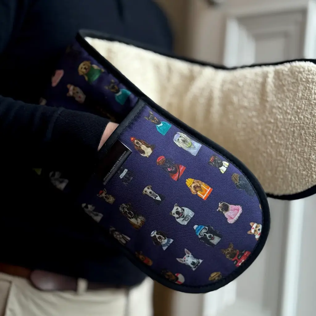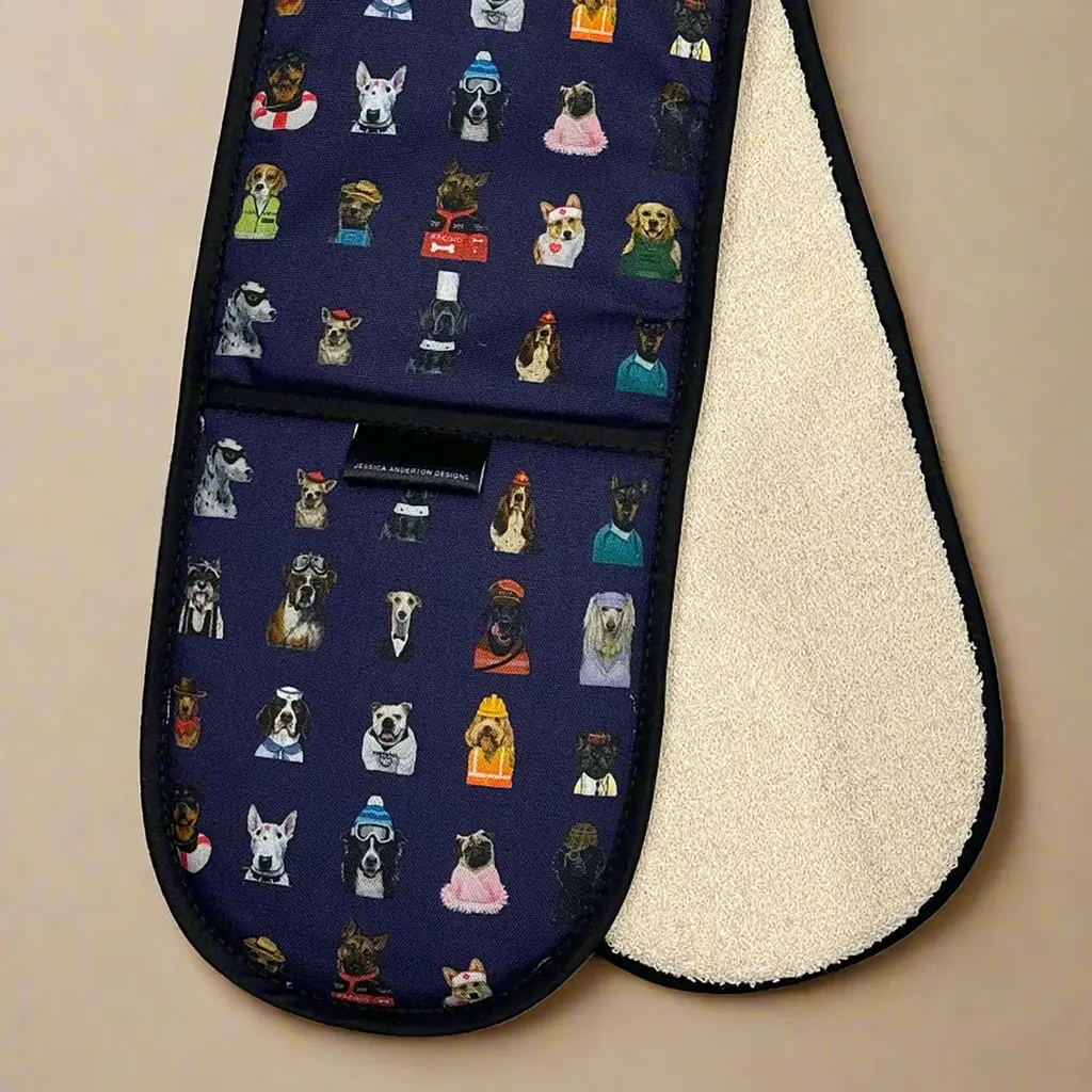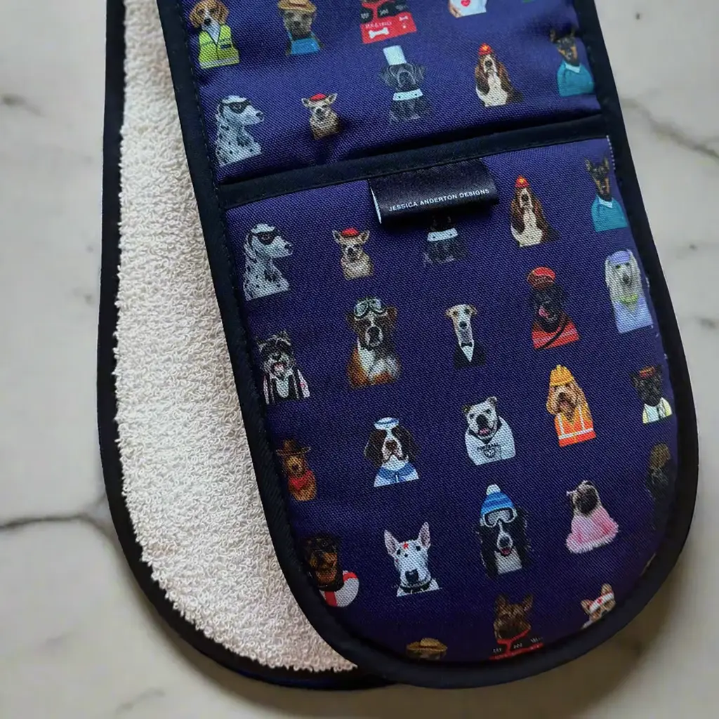 Beautifully bright & proudly made in Britain, these carefully crafted Double Oven Gloves are the perfect partner for the kitchen. Finished with a thick, heat-resistant terry towelling for protection, ensures these kitchen essentials are fit-for purpose as well as being stylish.Professionally hand-stitched by our trusted British supplier, this accessory is made from a durable 100% cotton, and printed using reactive inks, which results in a clear and vibrant colouring without any fading for years to come. They are machine washable for easy cleaning and look lovely draped over cooker rails, or hanged up using the handy loop.Looking for the perfect gift for a dog lover in your life? These double oven gloves ensure their delicious creations get from oven to table safely & in style.