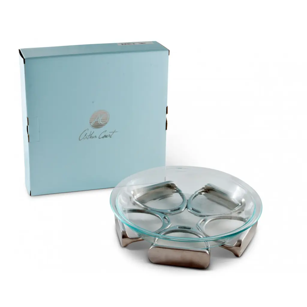 A completely unique Equestrian serve and décor piece, you will only find the Arthur Court Stirrup Trivet and Pie plate here. A ring of 5, true to life detailed, connected stirrup irons, hand-crafted in Arthur Court’s luxury grade proprietary aluminum alloy. The irons support an included clear glass pie plate.