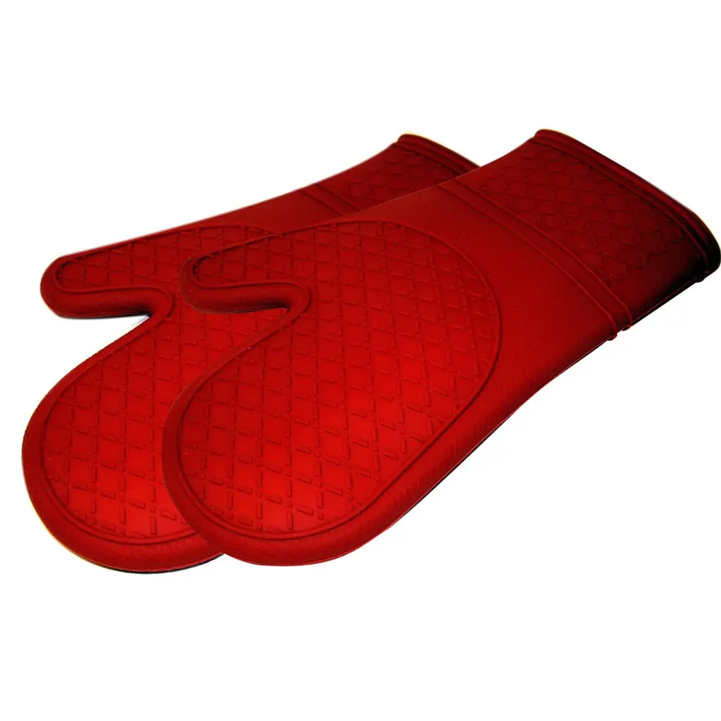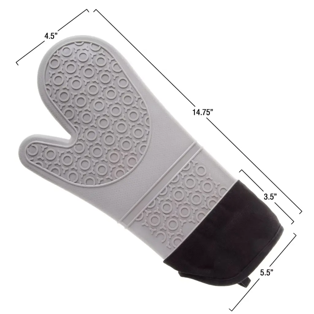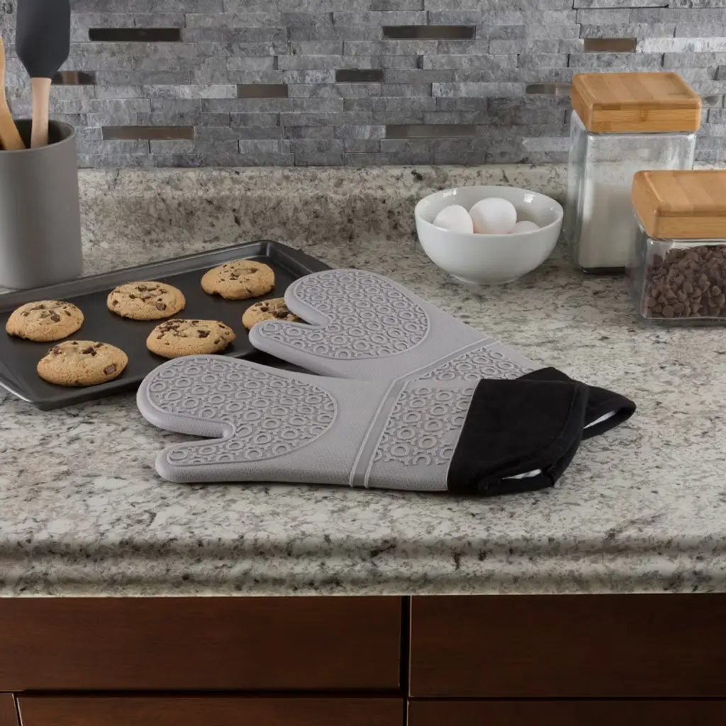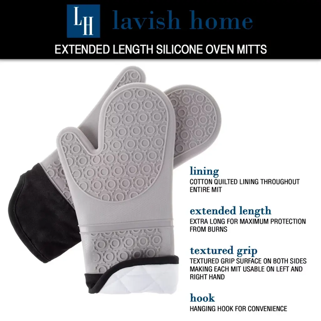 Enjoy maximum protection when removing pots and pans from the oven with these Extra-Long Silicone Oven Mitts by Lavish Home. Made with quilted cotton lining inside and silicone construction outside, this pair of oven mitts prevents heat damage to your hands, wrists, and forearms for safe, comfortable cooking every time. A textured grip surface on both sides creates an ambidextrous oven mitt design so you can slip these pot holders on either hand for quick, easy heat-resistant cooking.