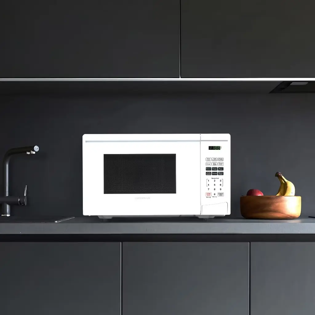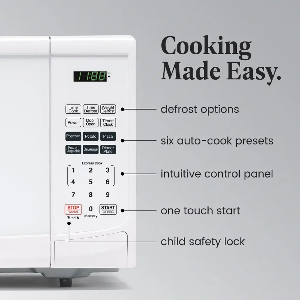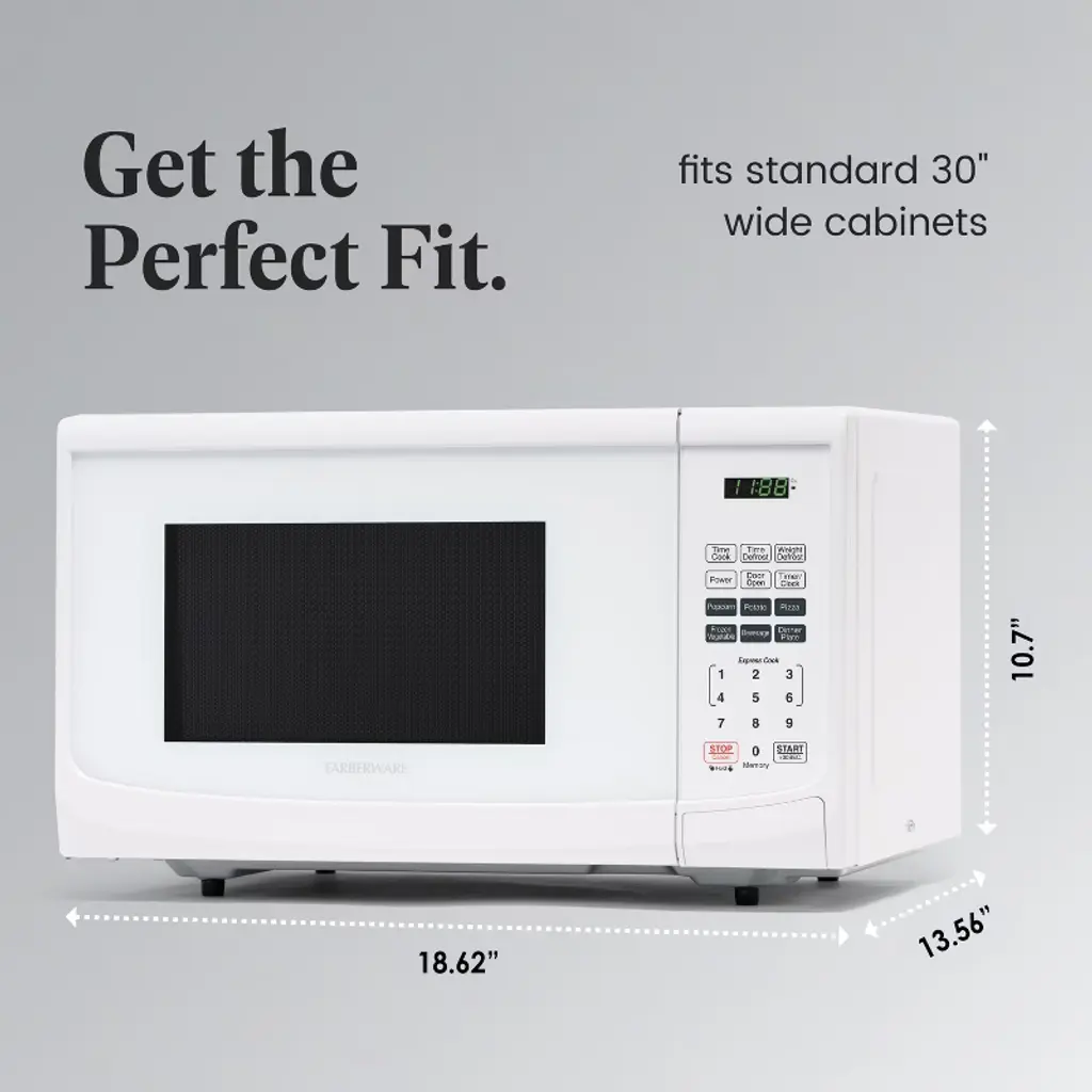 This Farberware 0.9 Cu. Ft. 900-Watt white microwave oven is the ideal size for office break rooms or smaller kitchens. 6 ONE touch cooking programs lets you optimally cook six of the most popular food items with the touch of a button. Choose from ten power levels up to 900 watts on this countertop microwave ovens. The large digital screen has a clock feature and can display a countdown timer in addition to the cooking time remaining. The memory function let you customize and save your favorite cook settings for added one-touch benefit. Quickly open or shut the microwave oven with the large, easy-to grip door and the child safety lock function provides an added level of security. The black exterior looks great in any type of cooking area. The small microwave can be activated for one to six minutes at 100 percent Power by just touching one of the express cooking buttons. If added cooking time is needed while the compact microwave is running, press the 30 second plus button to add an additional cooking time.
