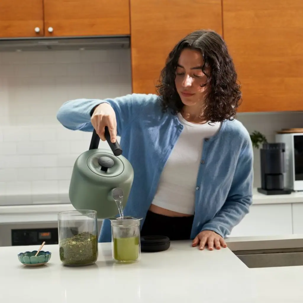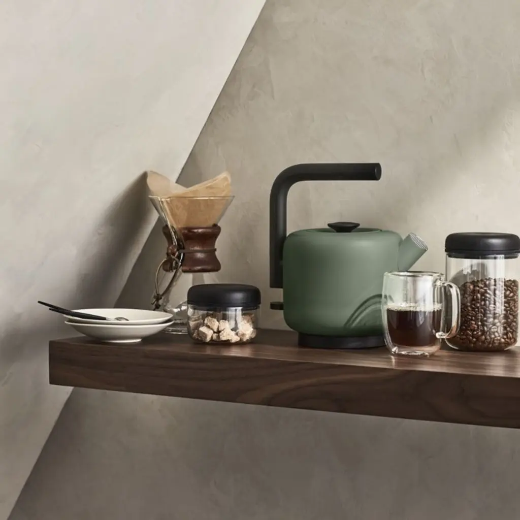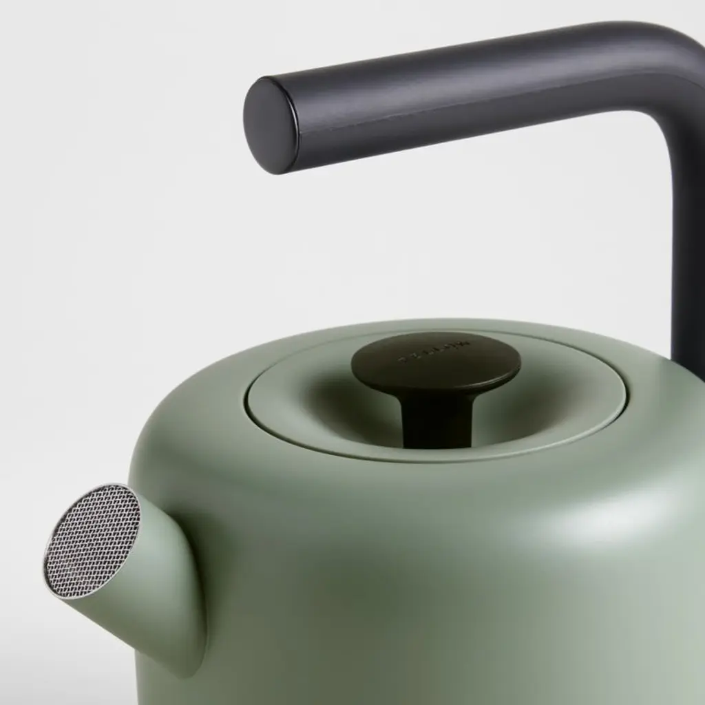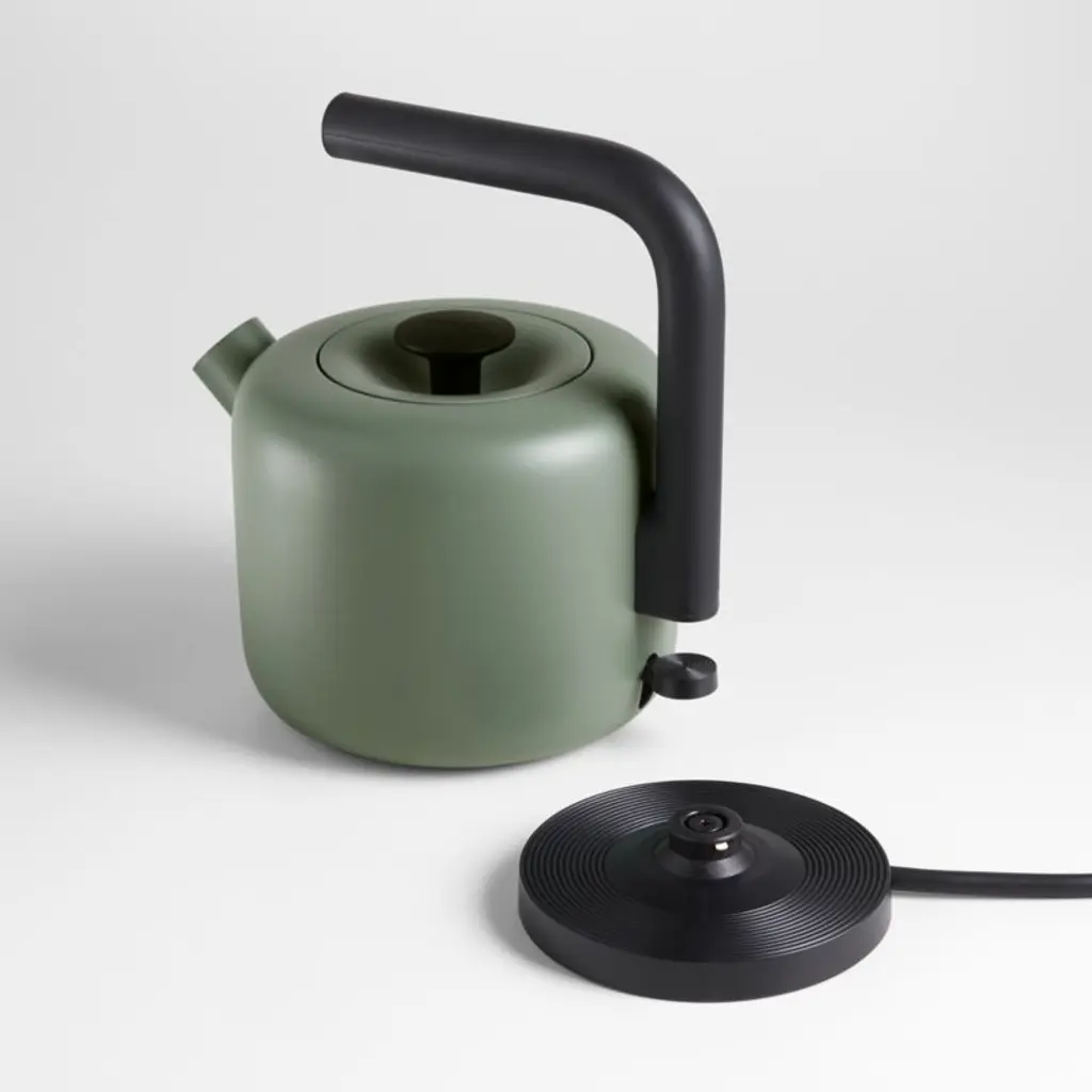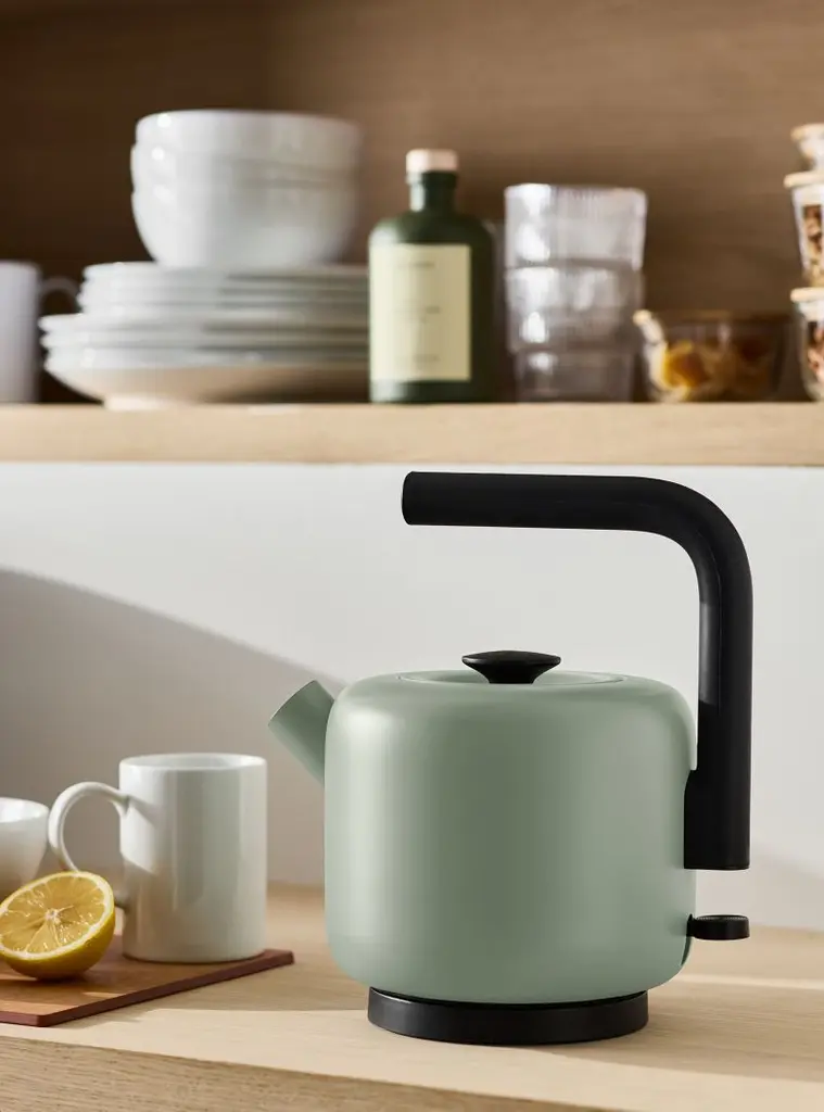 With its rounded contours, tubular curves, smoky green color and black accents, this electric kettle charms on the countertop as it boils up water for tea, pour-over coffee or instant oatmeal. At the ready for all your daily hot water needs, the 1.5-liter kettle brings water to a boil with a flip of its intuitive on-off switch. The arched black handle not only looks modern and sculptural, it's designed for easy one-handed pouring.