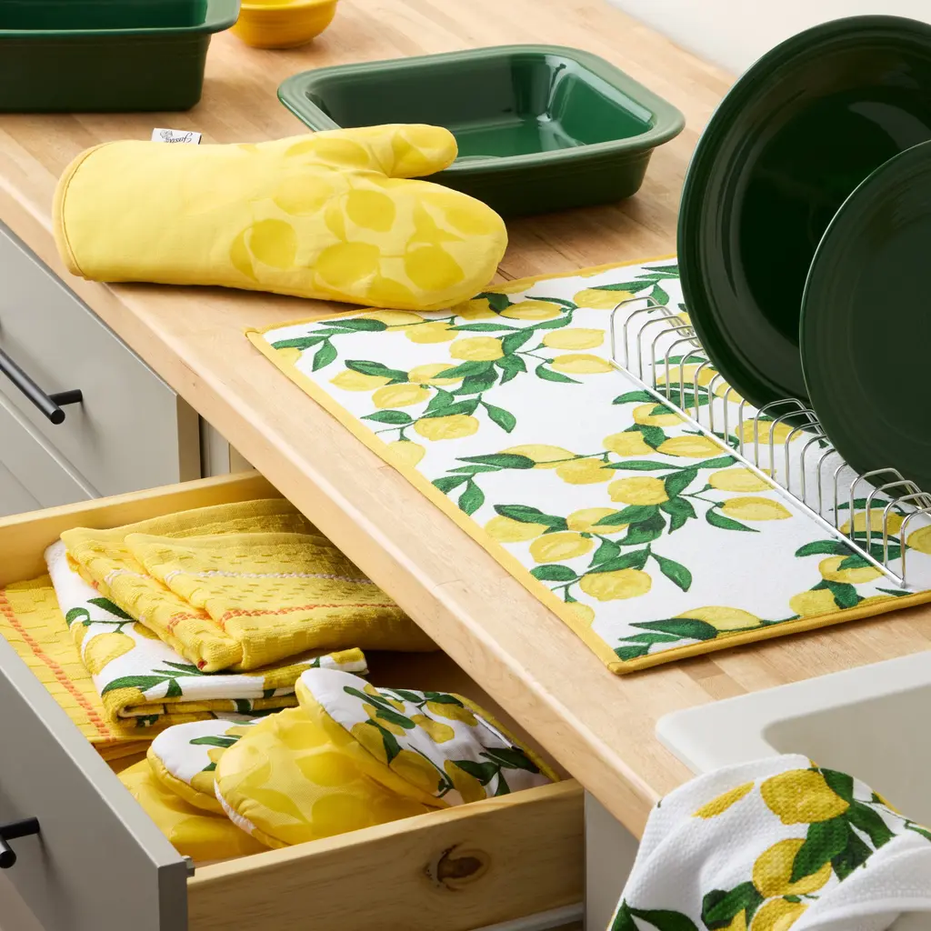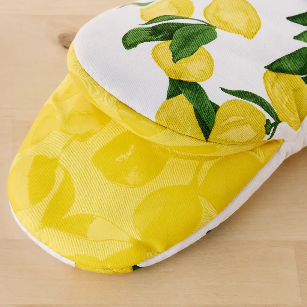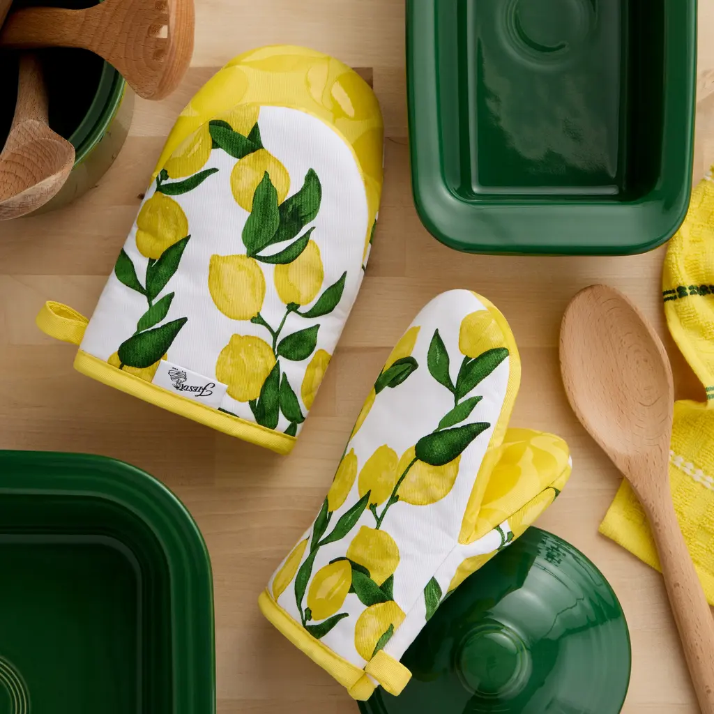 Get inspired to decorate and create in the kitchen with the Fiesta Lemon Vine Kitchen Collection. Whether you're looking for inspiring décor or every day functional kitchen essentials this stylish collection will bring color and comfort to your home. This mini oven mitt set includes two decoratively printed mini oven mitts. These heat resistant oven mitts are durable, flexible, and protect your hands while cooking or baking your favorite recipes. Use while celebrating seasonal holidays or for everyday use in your kitchen. Made of machine washable Cotton, these oven mitts are easy to clean, dry and store with decorative hang loop.