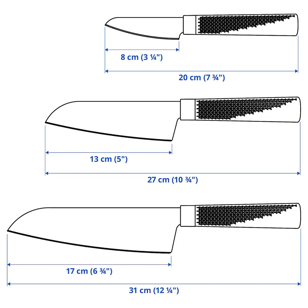FÖRSLAG 3-piece knife set. Whether it’s meat or vegetables, with this knife set you can cut, slice and chop most food. 15-year Limited Warranty. Read about the terms in the Limited Warranty brochure. Wash this product before using it for the first time.