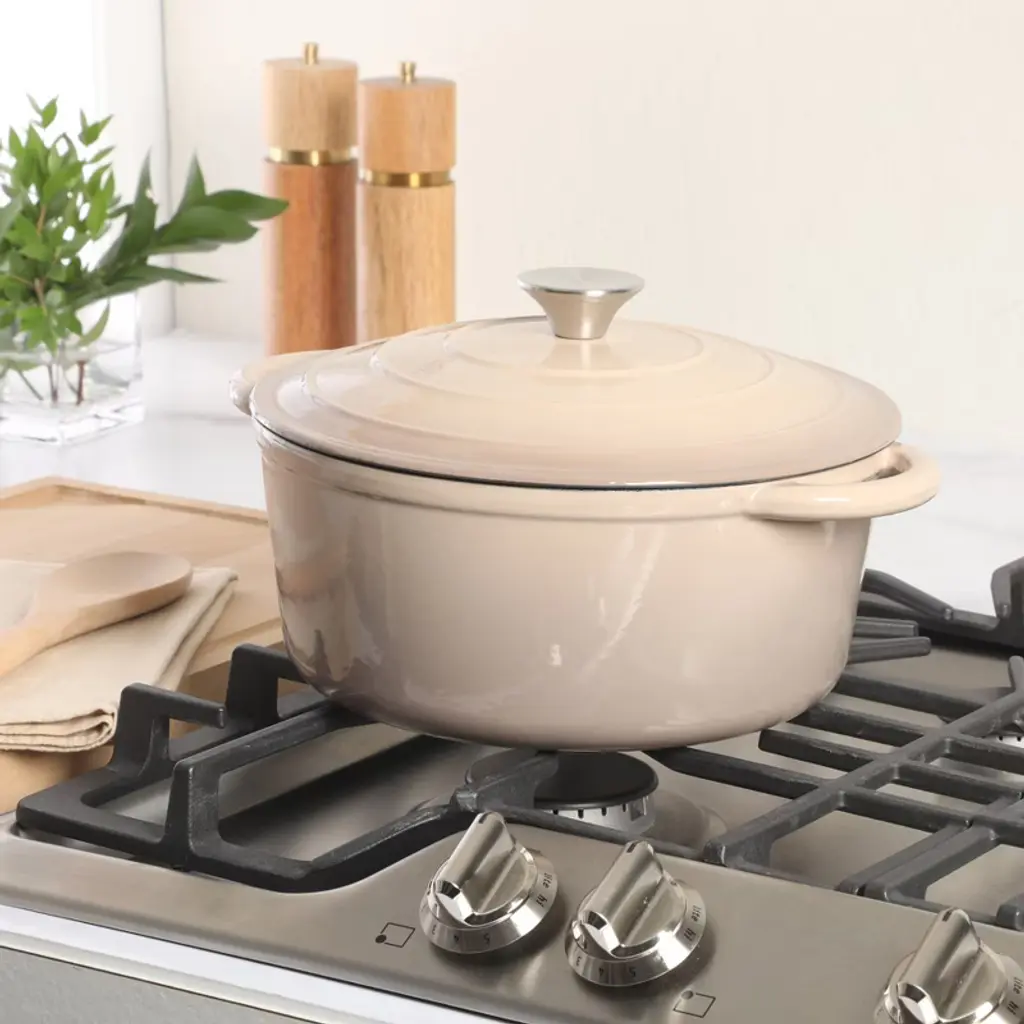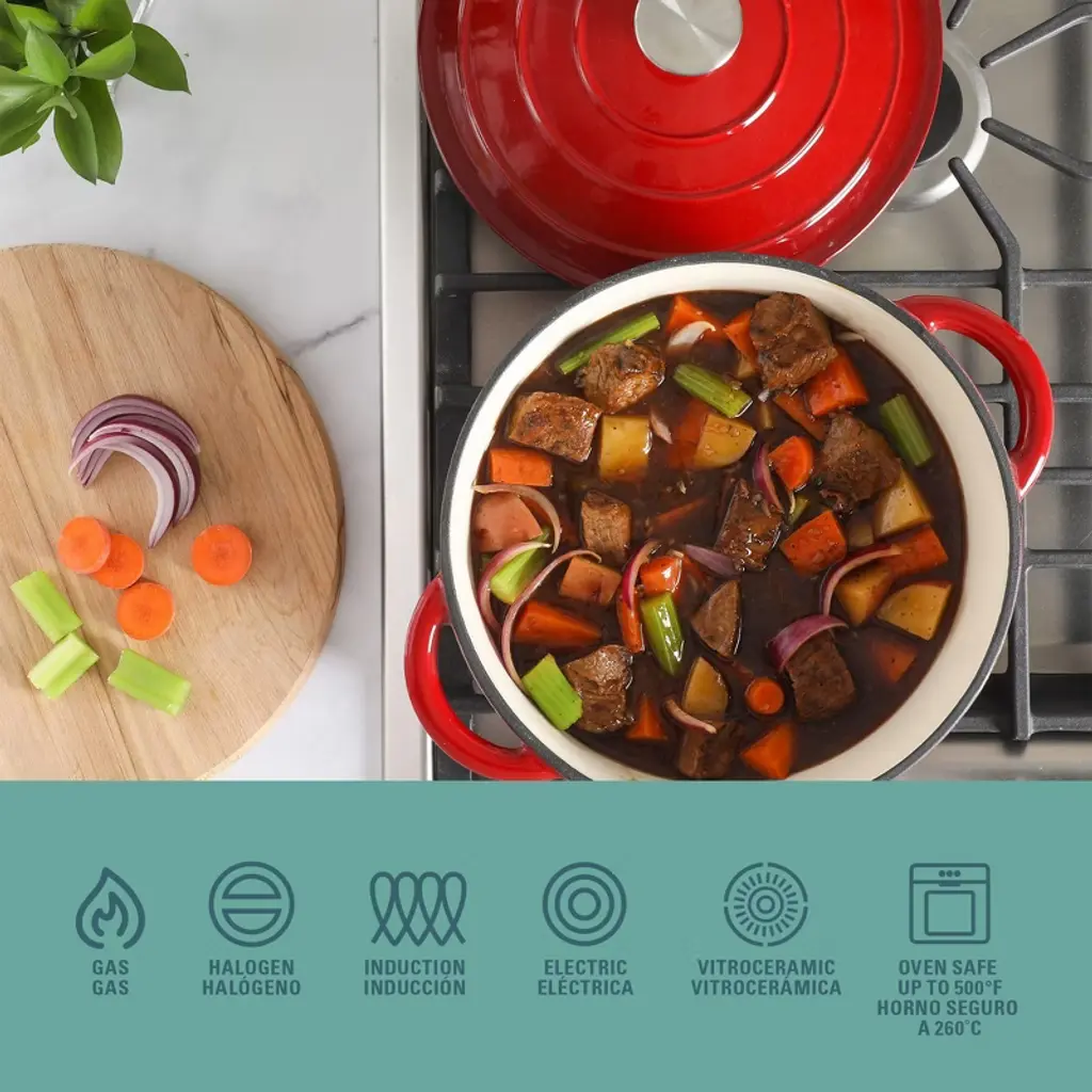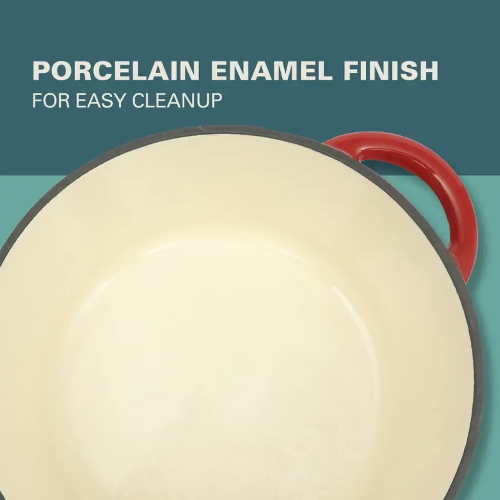 A cast iron Dutch oven is a classic piece of cookware and a worthwhile investment for new and experienced home chefs. The Addlestone 5-quart Enameled Cast Iron Dutch Oven with Lid is safe to use on all stovetops and in the oven up to 500°F. As a mult-use pot, this Dutch oven can slow-cook, bake, deep-fry and sear perfectly. Durable cast iron construction distributes and retains heat nicely and evenly, leaving no spot uncooked. Beautifully coated with porcelain enamel finish, it is easy to clean and maintain as it requires no constant seasoning compared to a pre-seasoned cast iron cookware. It comes with a self-basting lid to lock in the heat and redirect the moisture back onto the food. And when all the work is done, serve a warm, homemade meal in this vibrant Dutch oven that deserves to be at the center of every spread. Hand wash only. Make every home a Gibson Home. A multi-category collection of kitchen and dining essentials, Gibson Home offers style and value for everyday living. Enjoy preparing, cooking, and serving delicious meals in a wide selection of dinnerware, cookware, bakeware, cutlery, glassware, and more. Designed with function, reliability, and versatility, Gibson Home provides dining and entertaining staples to make every mealtime or gathering a culinary successA cast iron Dutch oven is a classic piece of cookware and a worthwhile investment for new and experienced home chefs. The Addlestone 5-quart Enameled Cast Iron Dutch Oven with Lid is safe to use on all stovetops and in the oven up to 500°F. As a multi-use pot, this Dutch oven can slow-cook, bake, deep-fry and sear perfectly. Durable cast iron construction distributes and retains heat nicely and evenly, leaving no spot uncooked. Beautifully coated with porcelain enamel finish, it is easy to clean and maintain as it requires no constant seasoning compared to a pre-seasoned cast iron cookware. It comes with a self-basting lid to lock in the heat and redirect the moisture back onto the food. And when all the work is done, serve a warm, homemade meal in this vibrant Dutch oven that deserves to be at the center of every spread. Hand wash only. Make every home a Gibson Home. A multi-category collection of kitchen and dining essentials, Gibson Home offers style and value for everyday living. Enjoy preparing, cooking, and serving delicious meals in a wide selection of dinnerware, cookware, bakeware, cutlery, glassware, and more. Designed with function, reliability, and versatility, Gibson Home provides dining and entertaining staples to make every mealtime or gathering a culinary success. * A BOX INCLUDES: One 5-quart enameled cast iron Dutch oven with lid * BEST IN VERSATILITY: Cast iron Dutch oven is an exceptional piece of cookware to braise and bake, fry and sauté, simmer and serve. Heavy-duty construction promotes superior heat distribution and retention. * PORCELAIN ENAMEL FINISH: Enameled surface never needs seasoning. Glossy finish is easy to clean and hard to miss with its beautiful, vibrant colorway. * EASY-GRIP HANDLES: Sturdy side handles offers a strong grip when serving from the oven to the table. * SELF-BASTING LID: Drip points underneath the lid allow continuous basting to improve flavor and texture * INDUCTION-FRIENDLY: Safe to use on induction, gas, electric, halogen and ceramic stoves * OVEN SAFE: Up to 500°F * CARE INSTRUCTIONS: Hand wash only
