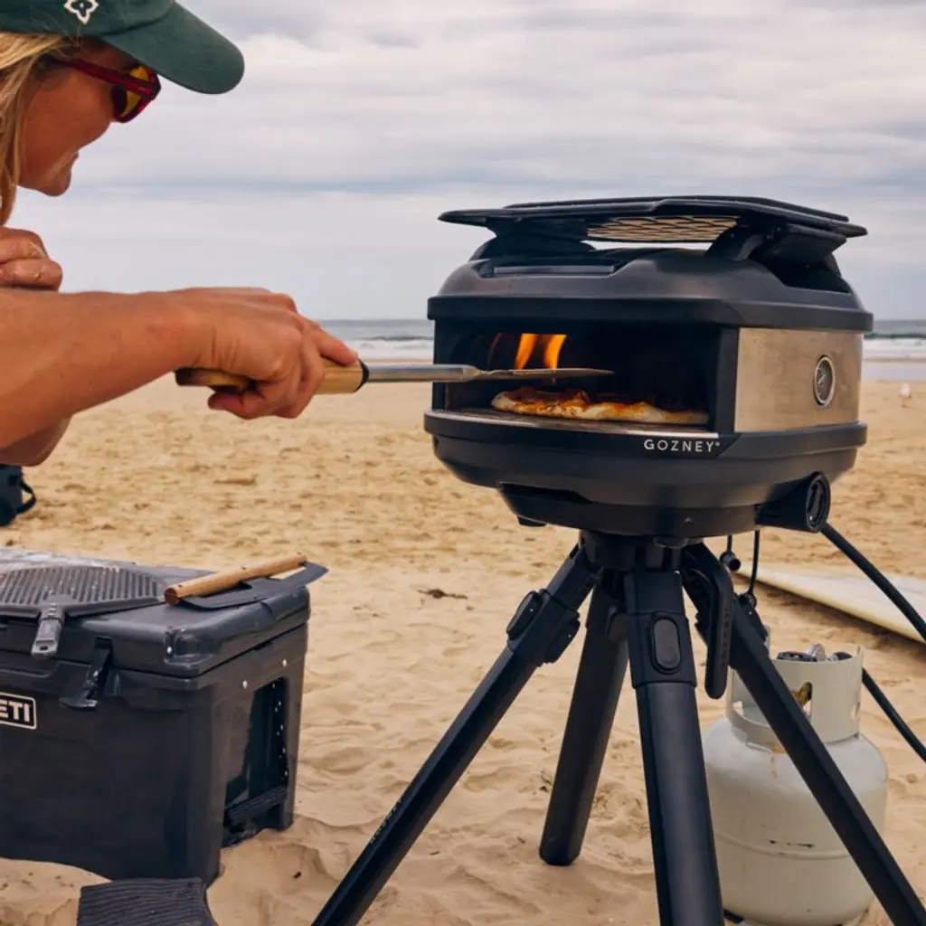 Enjoy restaurant-quality pizza anywhere with this portable oven made for adventure. The compact oven's lightweight-yet-rugged construction is designed to be toted to the beach, campground or any other alfresco pizza party. Gozney's ingenious rolling flame replicates a traditional wood-fired oven, reaching temperatures up to 950°F in no time and staying hot thanks to a layer of insulation Propane-fueled Tread accommodates pizzas as well as pans up to 12 inches so you can bake dinner, sides, dessert and breakfast on the go. And once cooking is complete, the off-black oven cools down quickly so you can pack up and move on.