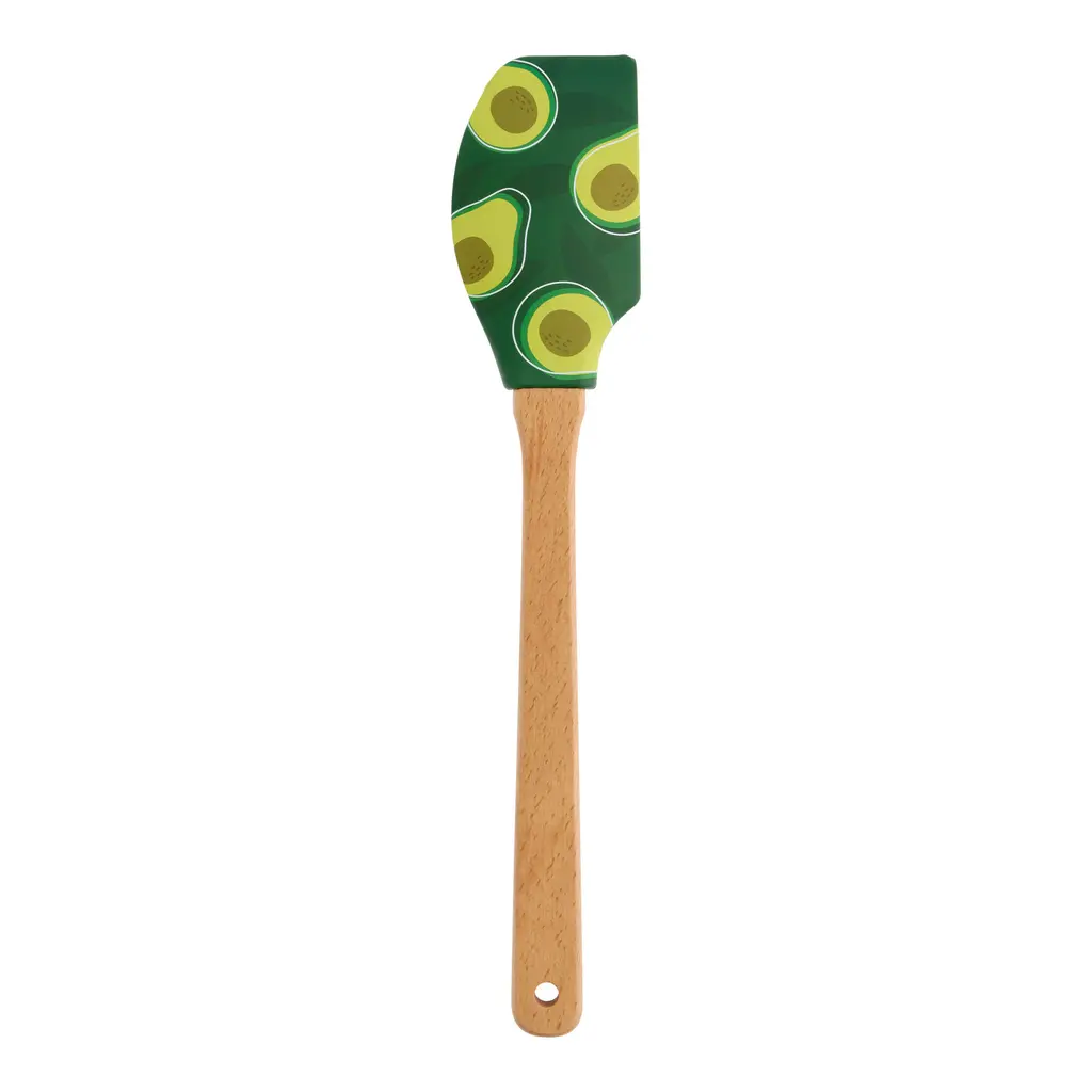 Featuring a deep green silicone head decorated with halved avocados, our spatula is cute and useful for cooking, baking, or "Just Guacin' Around" in the kitchen. With a heat-resistant head and comfortable wooden handle, this colorful kitchen tool is useful for a wide variety of mixing, folding, and spreading tasks. That's when you're not using it to scrape every tasty drop of guacamole from the sides of a blender or bowl!