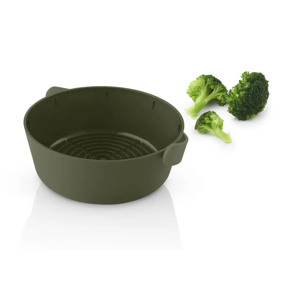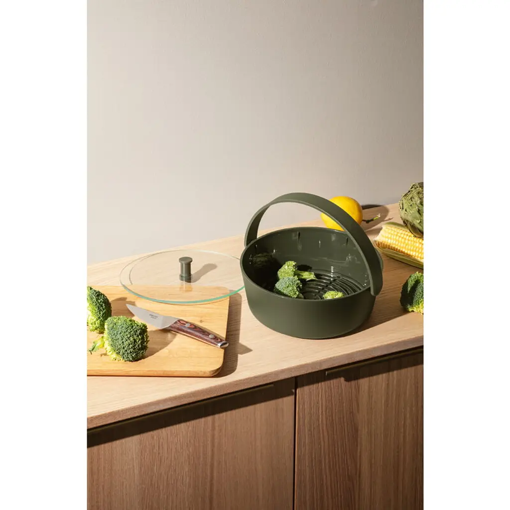 The Green Tools steamer by Eva Solo makes cooking veggies incredibly easy: just put the vegetables in the steamer, add a few tablespoons of water and cover with the lid. Cook in the microwave for a few minutes and, voilà, you have deliciously crunchy veggies still full of flavor and vitamins. Thanks to the minimalist design, the steamer doubles as a serving bowl. With the Green Tools series, Eva Solo encourages everyone to increase the amount of vegetables in their diet – the products have been developed for plant-based cooking and optimized specifically for preparing vegetables and fruits. The clean-lined, ergonomic kitchen tools are multifunctional, however, and perfectly suited for all types of cooking, whether plant-based or not.