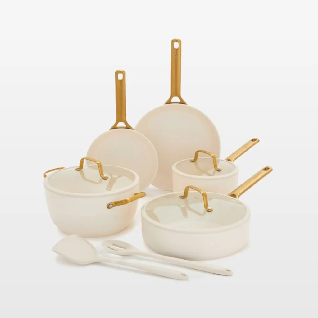 This GreenPan Reserve cookware set infuses world-class technology with modern, minimalist style. Matte gold handles adorn the sleek pans, contrasting with the creamy taupe finish and adding serious glam. Constructed with duo-forged, hard-anodized aluminum, the pans provide even heat distribution and superior performance. The diamond-infused Thermolon surface offers healthy cooking as well as easy release and clean up. And due to the advanced ceramic coating technology, you only need to cook on medium heat.