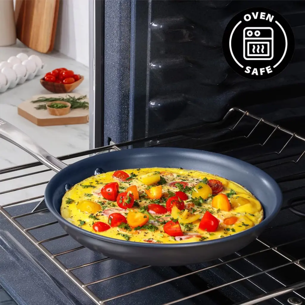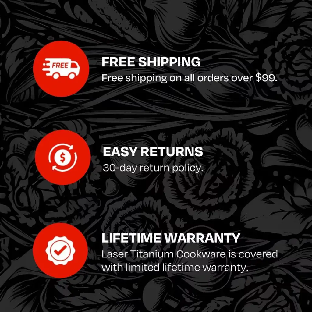 Laser Titanium hard anodized cookware features a new patent-pending technology with a safe non-toxic cooking surface without potentially harmful chemicals (PFAS, PTFE, PFOA). The cookware is non-stick, 3 times harder than stainless steel, safe for metal utensils and is oven safe up to 700°F.