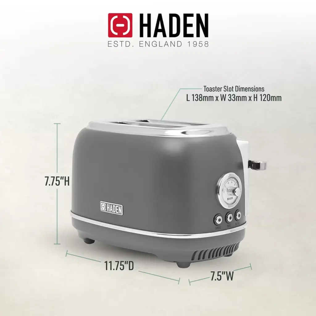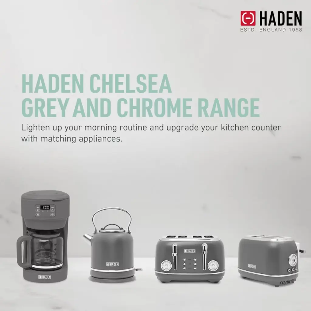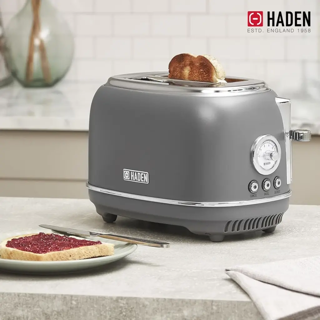 Upgrade your morning routine with the Haden Chelsea 2-Slice Wide Slot Toaster. Its sleek, durable stainless steel housing is a hallmark of modern kitchen convenience and its simple beauty is a perfect addition to any countertop or breakfast station. Featuring 2 extra-wide slots, this electric toaster fits a wide range of bread, from standard-sized to thick artisanal slices. Bagels and frozen waffles easily slide in, guaranteeing a toasting experience of perfection. The 2 slot toaster's self-centering function helps keep your bread and bagels perfectly positioned for even toasting, while the adjustable browning control empowers you to tailor the toastiness to your liking. Whether you prefer a light golden hue or a deep, rich crunch, this bread toaster accommodates your taste. The cancel, defrost, and bagel features of the bagel toaster adapt to your needs for added convenience. Cleanup is easy with the removable crumb tray that traps any residue, maintaining the toaster's fresh and clean appearance and functionality. Inspired by British homes, architecture, and landscapes, the Chelsea toaster is available in modern, elegant colors including glossy grey and chrome. The Haden Chelsea 2-Slice Countertop Toaster embodies the fusion of innovation and modern functionality. Add this toaster to your kitchen necessities and take your toasting experience to the next level.