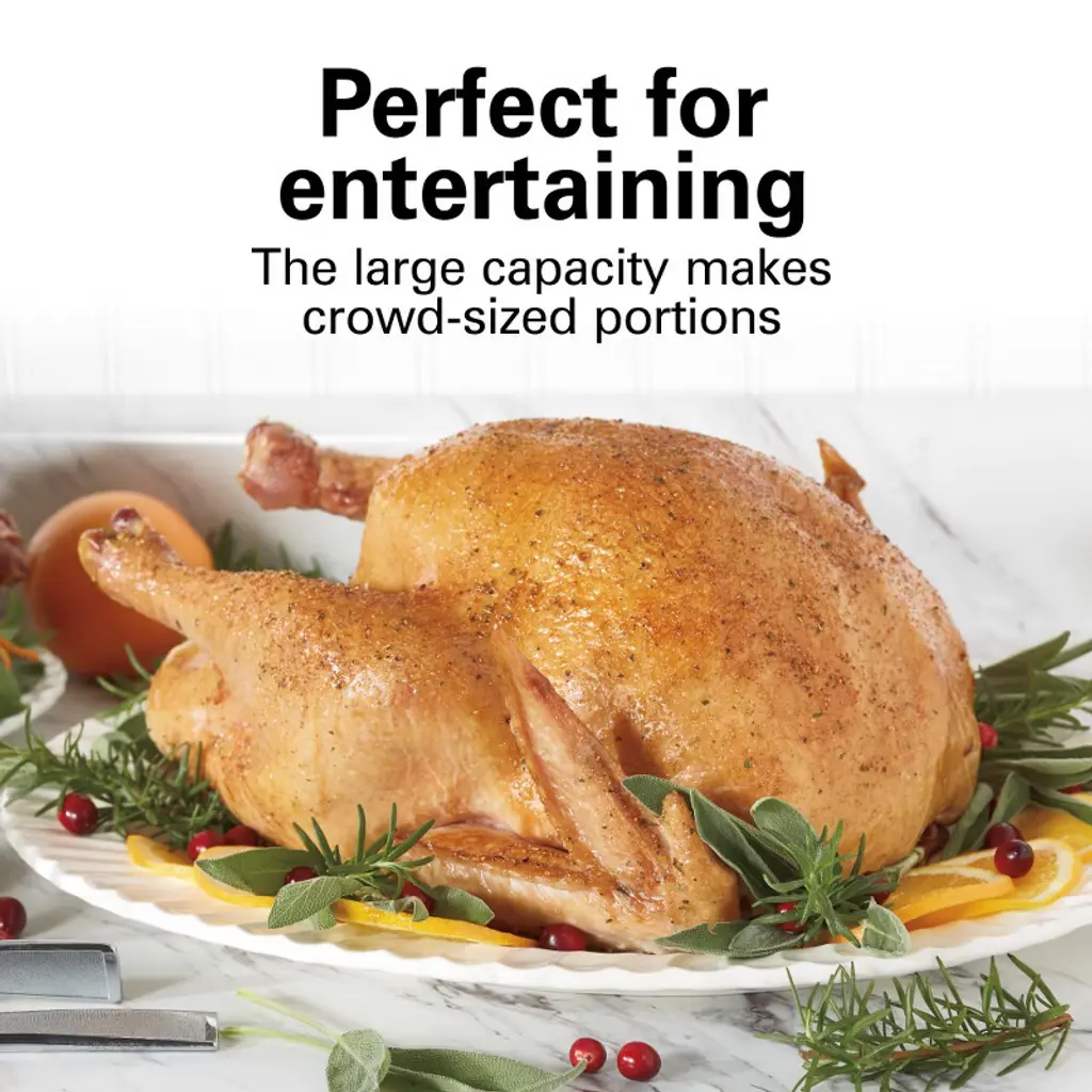 The versatile 20 quart Hamilton Beach® Electric Roaster Oven is perfect for the holidays and special occasions because it easily adds extra oven space to your kitchen when you need it. The roaster oven doubles your oven space and is easy to use, with excellent results meal after meal. It holds a 26 lb. turkey and is great for cooking large meats, but you can also use it to steam vegetables, bake potatoes, and even to make cheesecake. This versatile roaster oven steams, slow cooks, bakes, roasts, and keeps food warm for serving guests. Easily adjust the temperature from 125 to 450° F with one simple knob. You'll love the convenience of preparing your favorite foods in one pan, in a roaster that's simple and intuitive to use. The removable cooking pan conveniently lifts out for easy cleaning too. And the included lift-out rack makes it easy to remove large cuts of meat, like a baked ham or roasted turkey, from the roaster oven. The large capacity of the roaster oven makes it perfect for entertaining, whether you're feeding friends and family or hosting a special event.