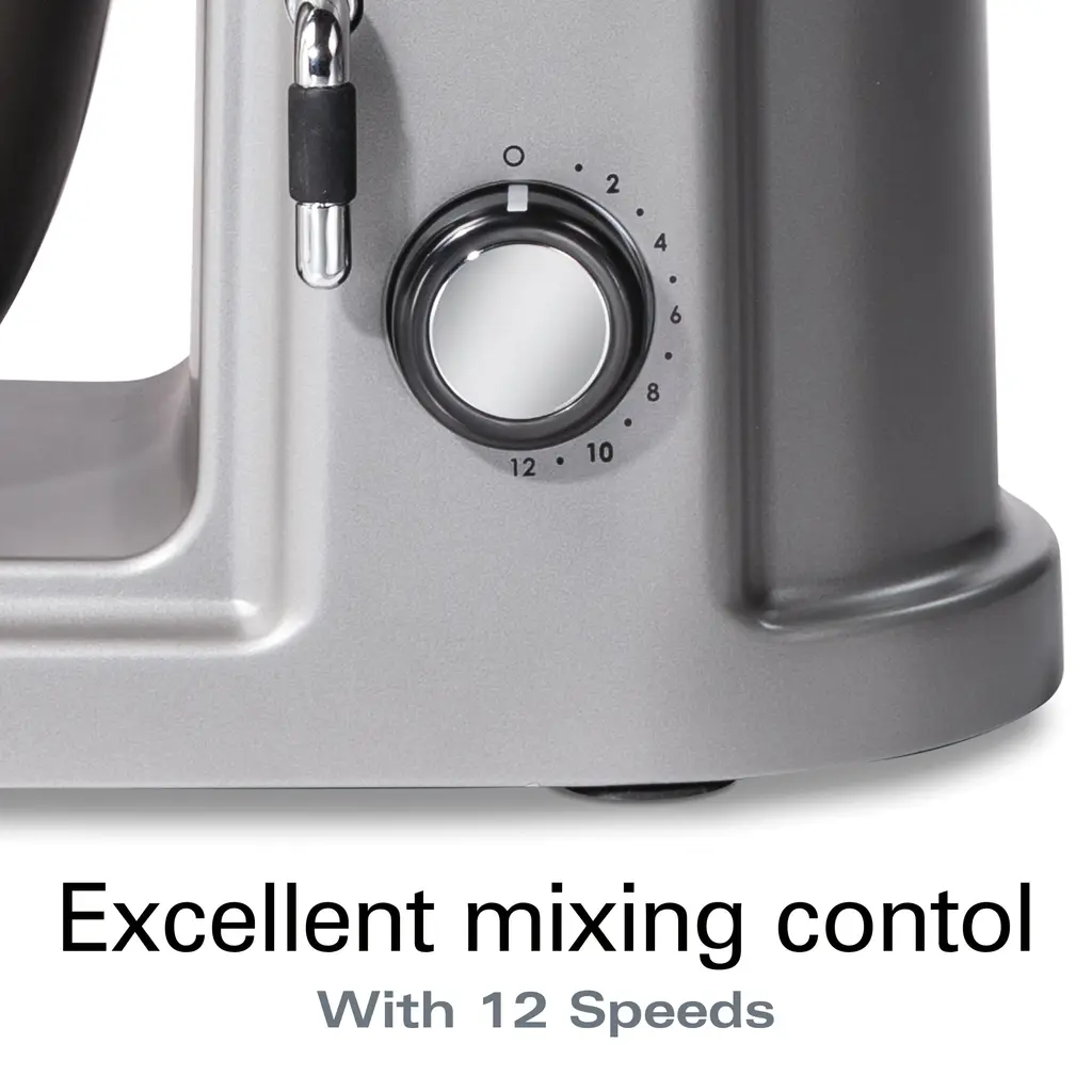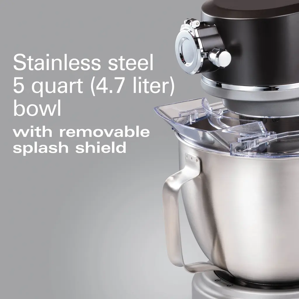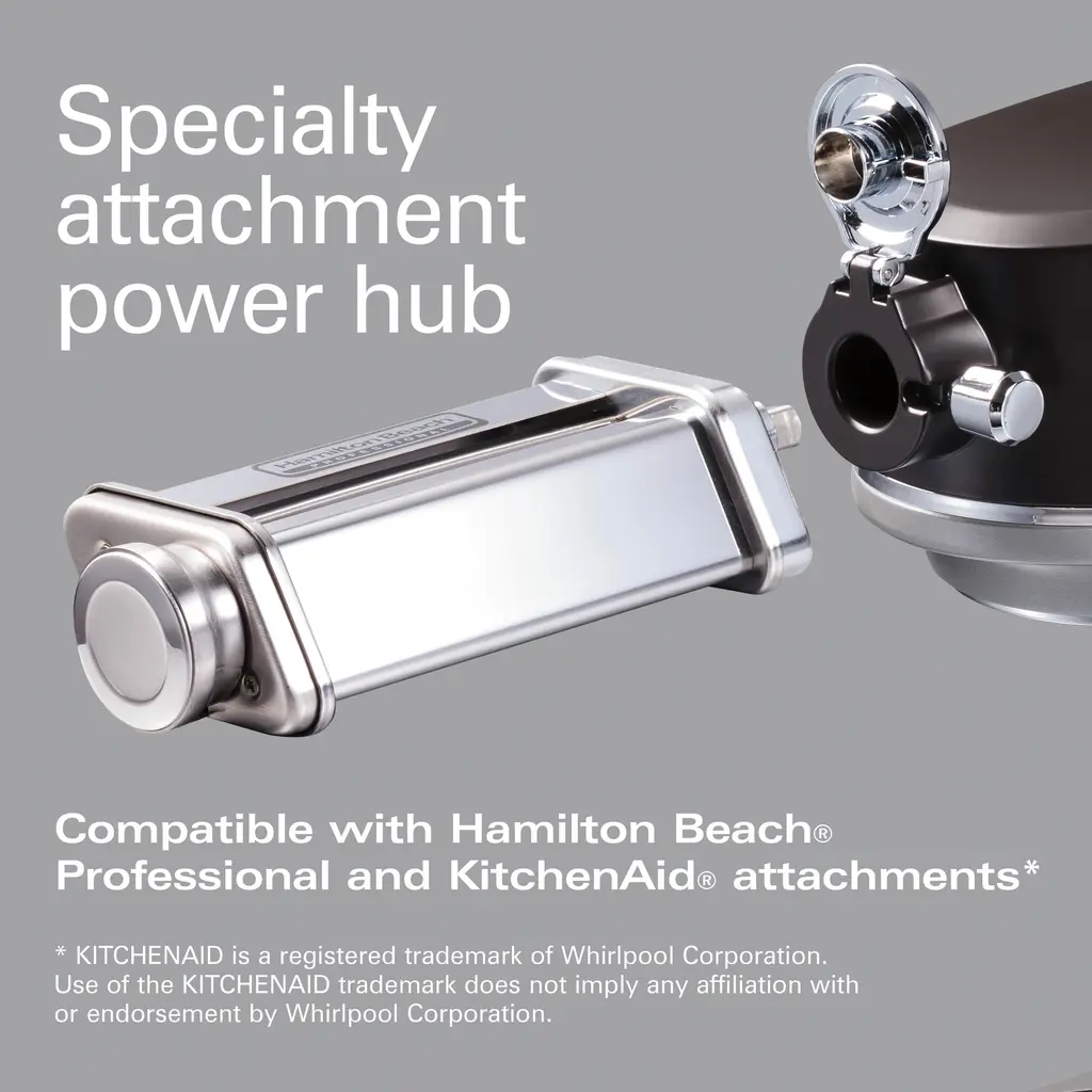 If there's one appliance every accomplished home chef needs in their kitchen, it's a professional-quality stand mixer. The Hamilton Beach® Professional All-Metal Stand Mixer helps dedicated cooks like you expertly create everything from cookie dough and cake batter to whipped cream and bread dough. It's built with a powerful 450-watt motor that handles every mixing task. Twelve mixing speeds take you from slowly folding ingredients all the way up to beating and whipping at top speed, and the planetary mixing action provides complete bowl coverage. The quick-release head tilts up for easy access to the 5 quart/4.7 liter bowl, and the splash/pour shield fits atop the bowl to help prevent splatters. In addition to the flat beater, whisk, and spiral dough hook, the Hamilton Beach® All-Metal Stand Mixer comes equipped with a power hub, so you can purchase add-on attachments for rolling pasta, grinding meat, slicing, and shredding. While this convenient power hub was designed for specialty attachments made by Hamilton Beach® Professional, it's also compatible with most KitchenAid®* stand mixer attachments. If you love baking, you'll appreciate having the Hamilton Beach® Professional All-Metal Stand Mixer in your kitchen. Its performance is backed by a 5 year limited warranty, so you can be confident that it will stand the test of time.