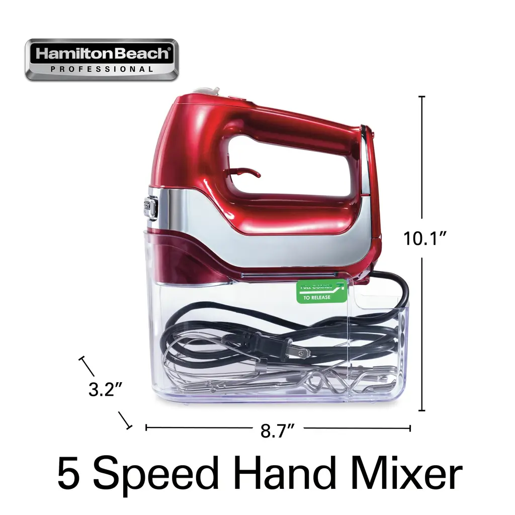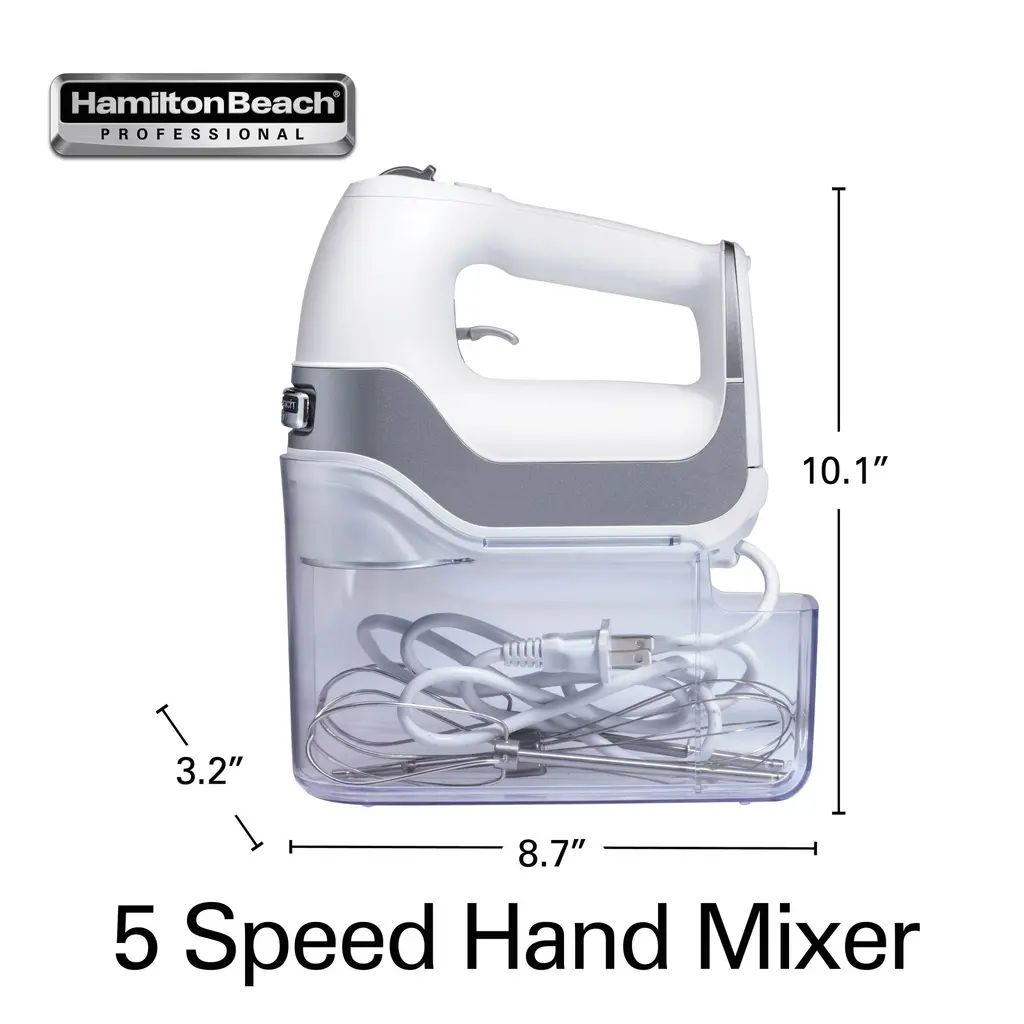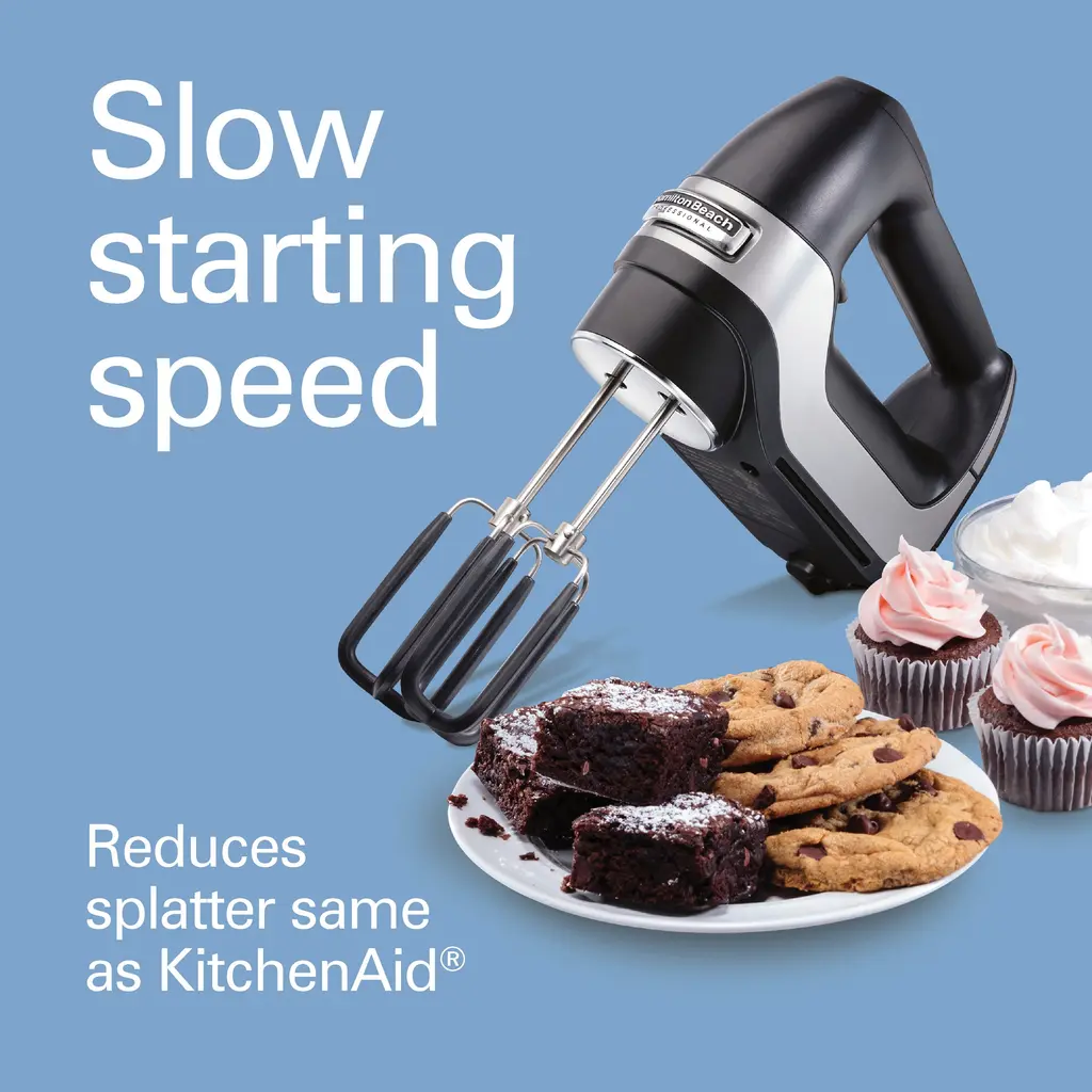 Whether it's lighter-than-air whipped cream or chewy chocolate chip cookie dough, you can mix ingredients effortlessly with the Hamilton Beach Professional 7-Speed Hand Mixer. Lightweight and powerful, this mixer has a slow start that prevents splatters, no matter what you're mixing. Push the QuickBurst button for an extra punch of power at any of the five levels. From mashed potatoes to whipped cream, this professional-grade hand mixer gives you the power and control to mix and blend with ease. A slow start feature reduces splatters and prevents clouds of flour and splatters of dough. The vent design and the matte finish make it easy to wipe the mixer clean. The 7 Speed Hand Mixer includes soft scrape beaters, whisk and dough hooks. A snap-on storage case keeps all accessories organized neatly. The beaters, dough hook, and whisk are dishwasher-safe. The swivel cord lock lets you adjust the cord to stay out of your way during mixing, whether you're left or right-handed. With a quick pull of the trigger, attachments release when you're done mixing. 5 year limited warranty.