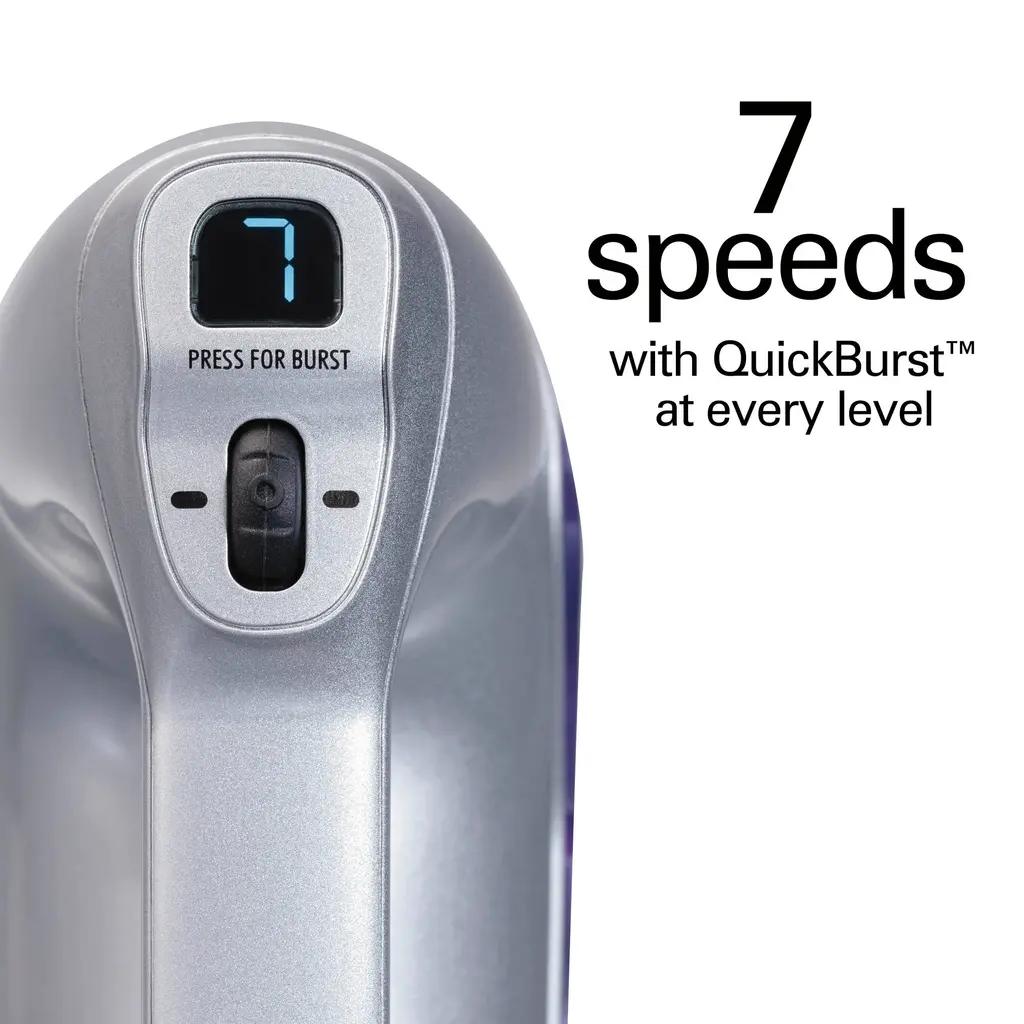 Whether it's a fluffy meringue or chewy chocolate chip cookie dough, you can mix ingredients effortlessly with the Hamilton Beach Professional 7 Speed Hand Mixer. Lightweight and powerful, this mixer has a slow start that prevents splatters, no matter what you're mixing. Push the QuickBurst button for an extra punch of power at any of the seven speeds. A lockable swivel cord, snap-on storage case and trigger-release makes mixing easy from start to finish. Powerful, effortless mixing From mashed potatoes to whipped cream, this professional-grade hand mixer gives you the power and control to mix and blend with ease. Slow start reduces splatters prevent clouds of flour and splatters of dough by starting slow and gently increasing speed. The vent design and the matte finish make it easy to wipe the mixer clean. Includes soft scrape beaters, whisk and dough hooks. A snap-on storage case keeps all accessories organized neatly. QuickBurst at every level adds a quick burst for a slow, gentle mix or for a fast whip. With a quick pull of the trigger, attachments release when you're done mixing. Swivel cord lock lets you adjust the cord to stay out of your way during mixing, whether you're left or right-handed. Hamilton Beach Professional 7 Speed Hand Mixer's exceptional performance and superior durability is backed by a 5 year limited warranty.