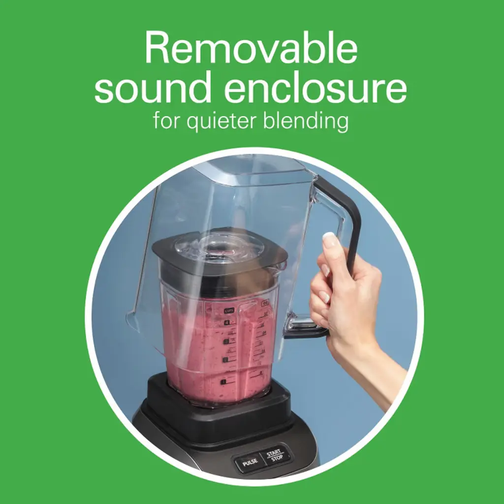 Increase your blending power while reducing noise with the Hamilton Beach Professional Quiet Blender. The 2.0 peak horsepower motor powers stainless steel blades to speeds over 105 mph to blast through ice, frozen fruit, and other tough ingredients in just seconds. With rubber-mounted components, a motor designed with optimal air flow and a removable shield, this blender is significantly quieter than leading competitors. The quiet shield can also be used as a serving pitcher.Effortlessly create perfectly blended smoothies, juice whole fruits and vegetables, puree hot soups, emulsify dressings and grind spreads. With a variable speed dial, you control the blending to achieve restaurant quality results every time. Or choose pre-programmed smoothie, ice crush or puree settings for one-touch convenience. A tamper is included to help blend thick or frozen mixtures. The clean setting makes washing your jar a breeze, and all parts are dishwasher safe.Powerful PerformanceGet the power the pros have - with a commanding 1500 watts of power and a 2.0 peak horsepower motor, the Hamilton Beach® Professional Quiet Blender delivers the performance you need for restaurant-quality results. Hardened stainless-steel blades rotate 105 mph to power through ice and tough ingredients in seconds.Ultimate ControlWhether you’re whipping cream or chopping up ingredients for a fresh salsa, the variable speed dial gives you ultimate control over the blending process. The pulse function can be used at any speed for mixing and chopping without over processing to achieve the ideal texture.Pre-Programmed for Easy BlendingFour pre-programed settings eliminate guesswork and offer one-touch convenience. For smoothie, ice crush and puree, simply add ingredients; choose the program by turning the dial, and press start. Use the clean setting for a quick wash. The blender automatically stops at the end of the program.Tamper IncludedA tamper is included to help you blend frozen or thick mixtures, like nut butter, to the perfect consistency.Easy to CleanAdd warm water, dish detergent to blender jar and use the pre-programmed clean setting for a quick clean. The blender jar, lid and tamper are all dishwasher safe as well.5 Year Limited WarrantyHamilton Beach Professional Quiet Blender’s exceptional performance and superior durability is backed by a 5 year limited warranty.Hamilton Beach ProfessionalInspired by our 100 years of experience designing products used in commercial kitchens, Hamilton Beach Professional is a line of countertop kitchen appliances with professional-level components designed to deliver exceptional performance and superior durability for the serious home cook. Thoughtful features like precise speed control, convenient pre-programmed settings, and powerful motors to push through any job will make your time in the kitchen easier and more enjoyable.