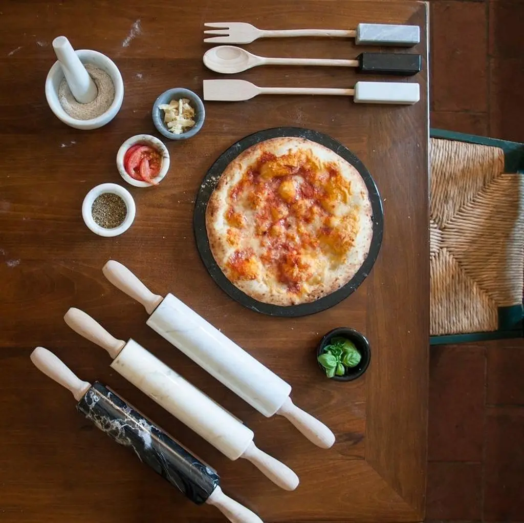Grey Bardiglio marble rolling pin with wooden handles. It is assembled manually. Each piece is in a way unique (every marble block is different in veins and shades) and handmade by Italian artisans specialized over generations in processing marble. Slight variations in shape, color and size are to be considered a guarantee of an handmade creation.Important: Do not use lemon or vinegar on it, clean only with water and natural soap (like Marseilles soap), do not put in dishwasher.This object gives a distinct touch to your kitchen and can be a very sophisticated gift.