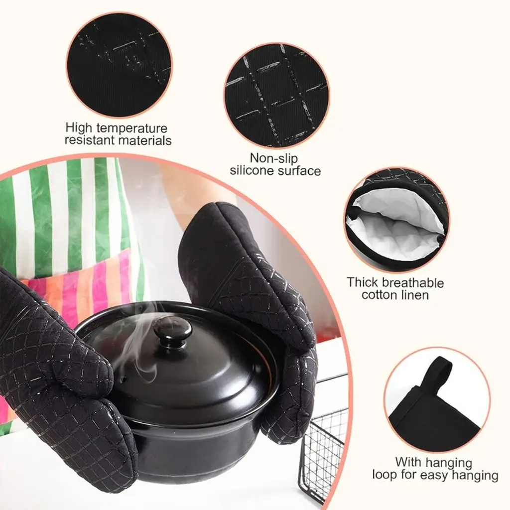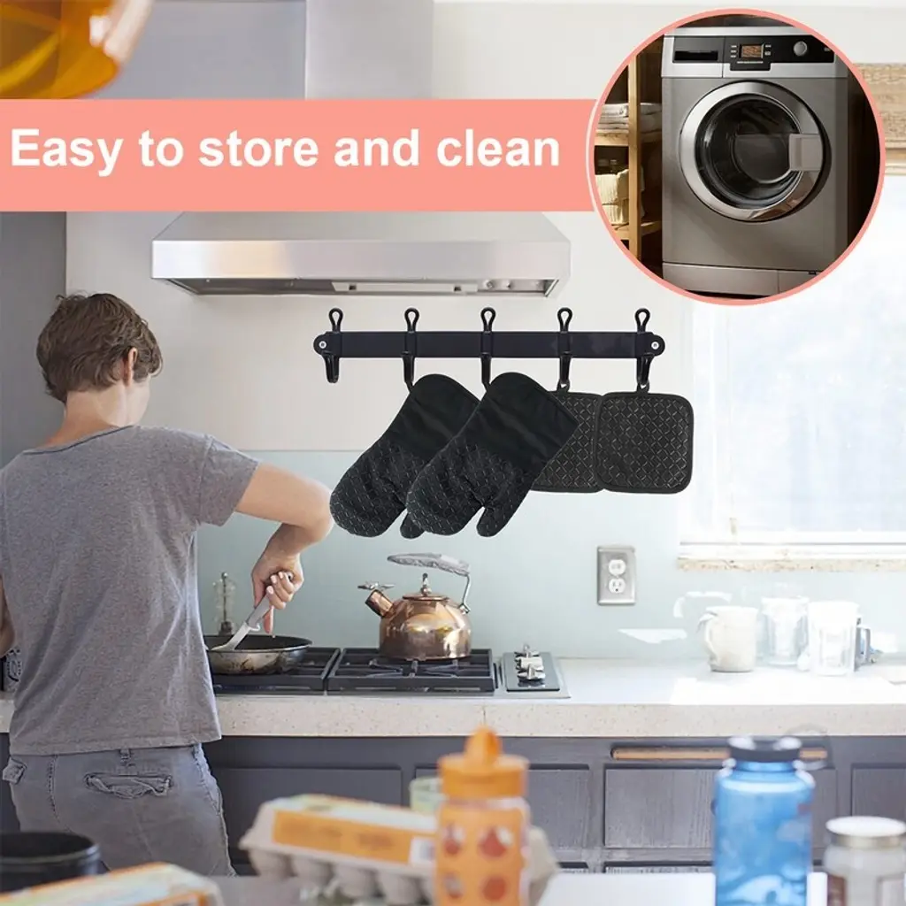 Complete 2/4-Piece Oven Mitts & Pan Rack Set - Includes 1–2 heat resistant silicone oven mitts (6.7"x11.8") and 1–2 pot holders (6.9"x6.9"). Perfect for indoor baking, stovetop cooking, or BBQ grilling. A thoughtful gift for chefs and home cooks alike.Heat-Resistant BBQ Gloves with Soft Cotton Lining - These grill gloves feature a breathable, quilted cotton lining for lasting comfort while handling hot pans, trays, or racks. Designed for all-day kitchen use—washable and durable.500°F Protection with Non-Slip Silicone Grip - Built to withstand up to 500°F, our cut-resistant oven mitts offer a textured silicone surface for a strong grip. Ideal for baking trays, grill tools, or oven racks.Convenient Hanging Loops for Storage - Each glove and pot holder includes a loop for easy hanging. Keeps your kitchen organized while your BBQ gloves stay accessible and dryVersatile Gloves for Baking, Cooking & Grilling - From everyday meal prep to weekend BBQs, this oven mitt and pan rack set is essential for safe and stylish cooking. Great for roasting, smoking, or handling hot dishes.