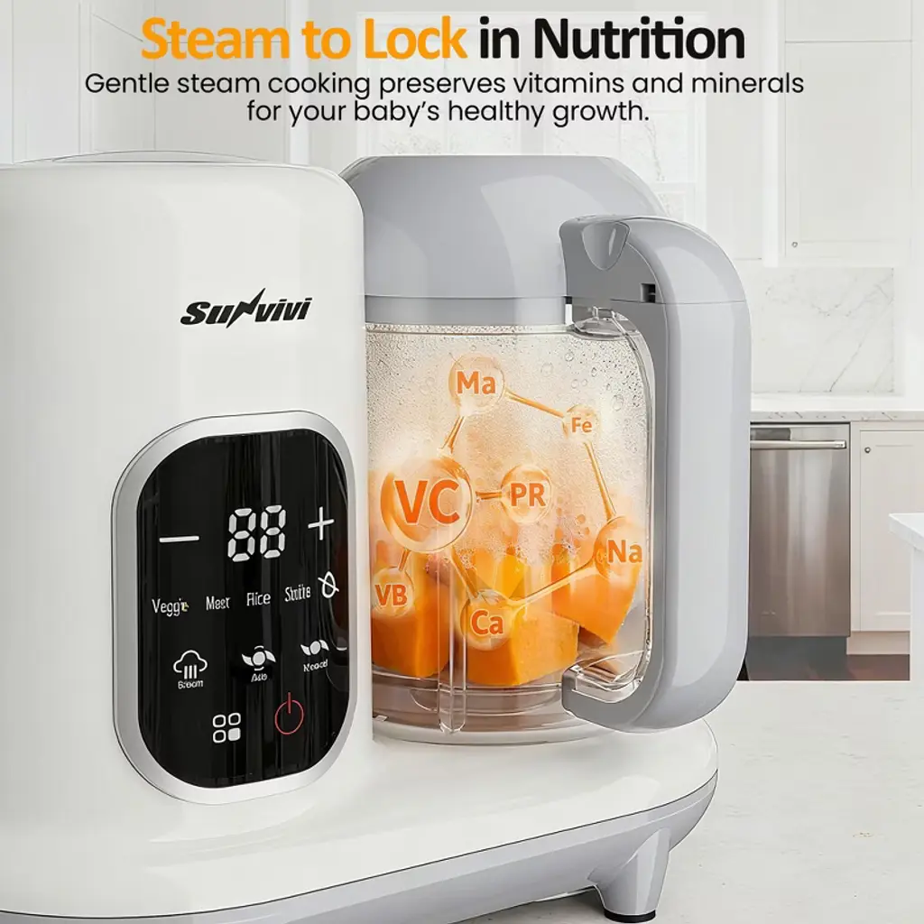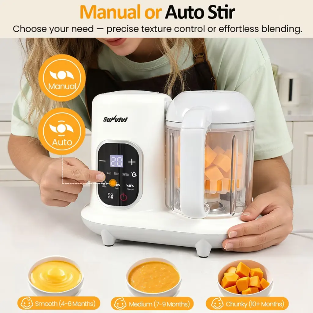 Effortless Meal Prep for Busy Parents Simplify mealtime with this all-in-one baby food maker. Whether you¡¯re preparing purees, soups, or family meals, this electric blender and food processor combo takes care of everything¡ªfrom steaming and heating to automatic stirring. Its advanced steaming technology locks in the freshness and nutrients of fruits, vegetables, and meats, ensuring every bite is packed with goodness. The intuitive LCD touchscreen makes operation a breeze, while the auto-cleaning feature saves you time and effort. Perfect for busy parents, this versatile kitchen tool helps create healthy, homemade meals for your little one without the hassle. Specification: Product Name: Baby Food Maker Color: White Material: PP + 304 Stainless steel + ABS Dimensions: 9.45"L x 5.12"W x 8.3"H Maximum Capacity: Water tank capacity: 220ml Steaming basket capacity: 300g Stirring capacity: 350g Voltage: 120V Power: Stirring 120W, Heating 300W Weight: 3.2 lbs Certification: FCC CE ROHS CPC FCM