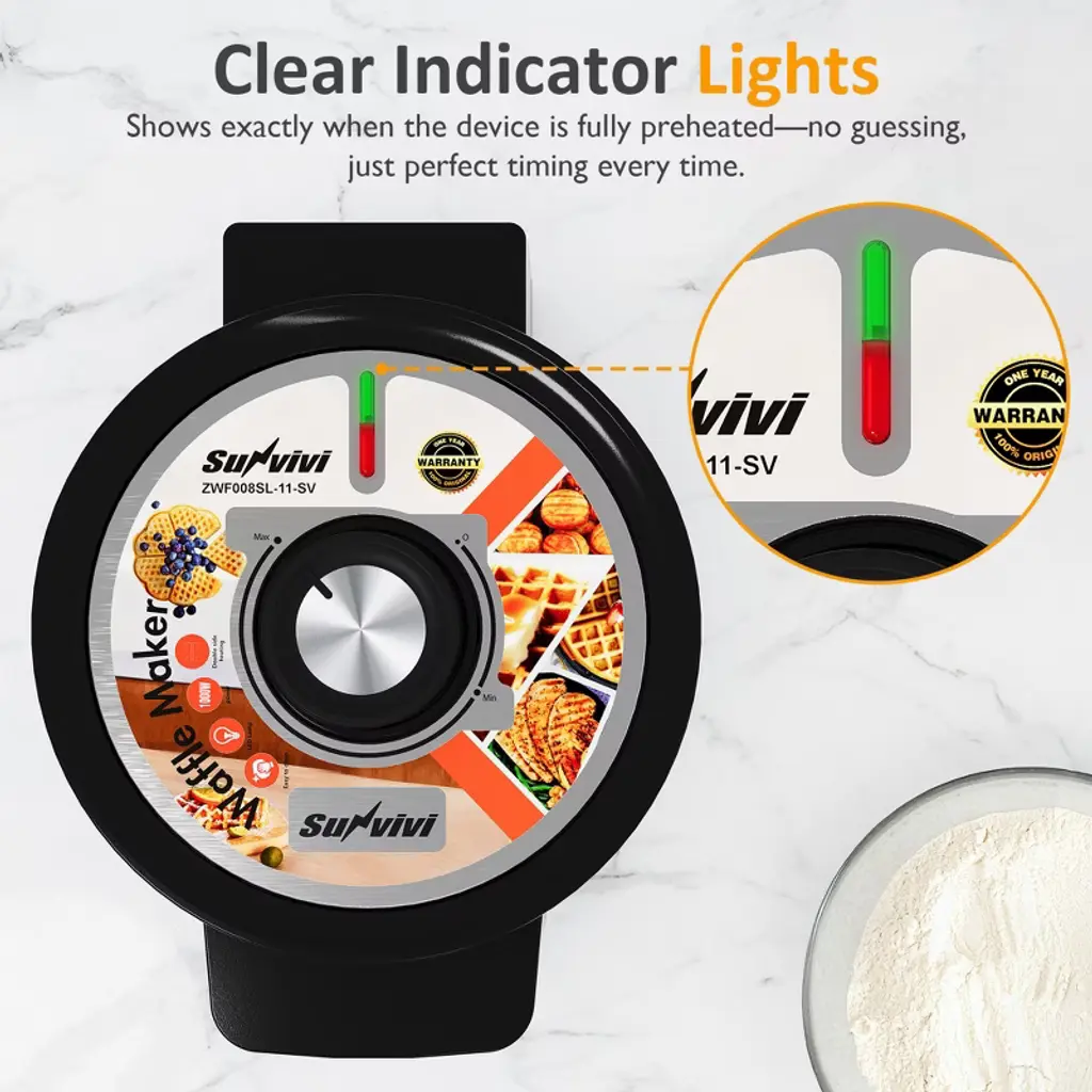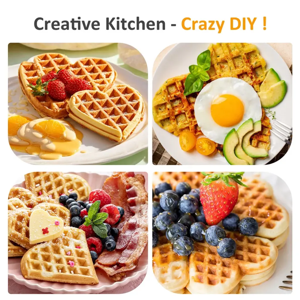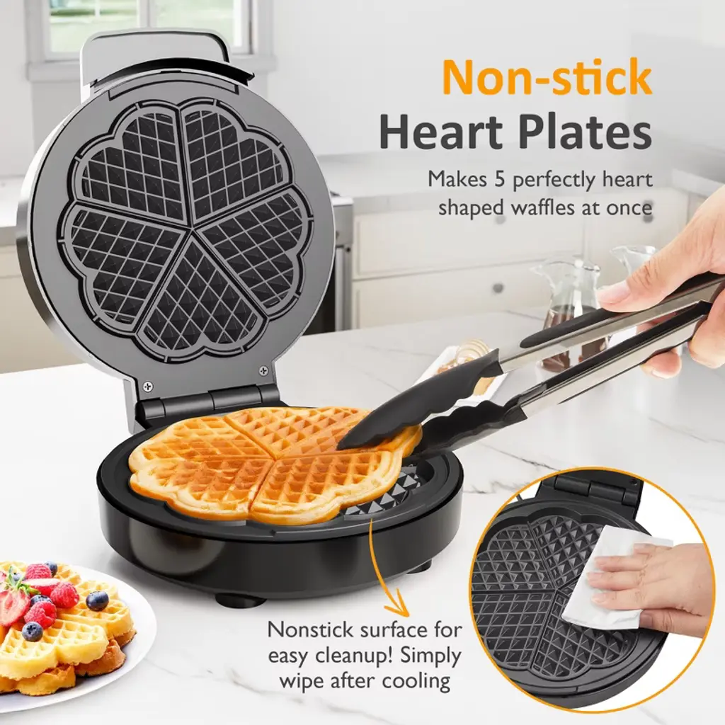 Heartfelt Waffle Moments Start your day with a touch of love! This heart-shaped waffle maker bakes 5 perfectly golden waffles at once, turning every breakfast into a special moment. Whether you're surprising your kids with a fun start to their day or making a sweet treat for your partner, this waffle maker brings warmth and joy to any occasion. Its adjustable temperature control ensures perfect texture every time, while the quick heating system saves you time without compromising on quality. Compact, easy to clean, and full of love¡ªmake your mornings a little sweeter. Specification: Product Name: Waffle maker Color: Black + Silver Material: Aluminum Dimensions: 7.68"L x 9.65"W x 4.5"H Plate Diameter: 7.5" Voltage: 120V Power: 1000W Weight: 2.6 lbs Certification: UL/ETL