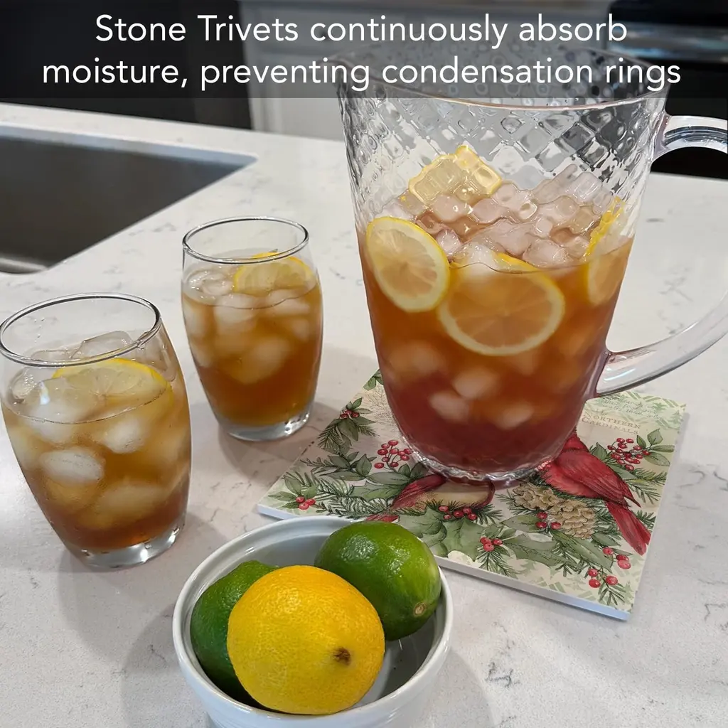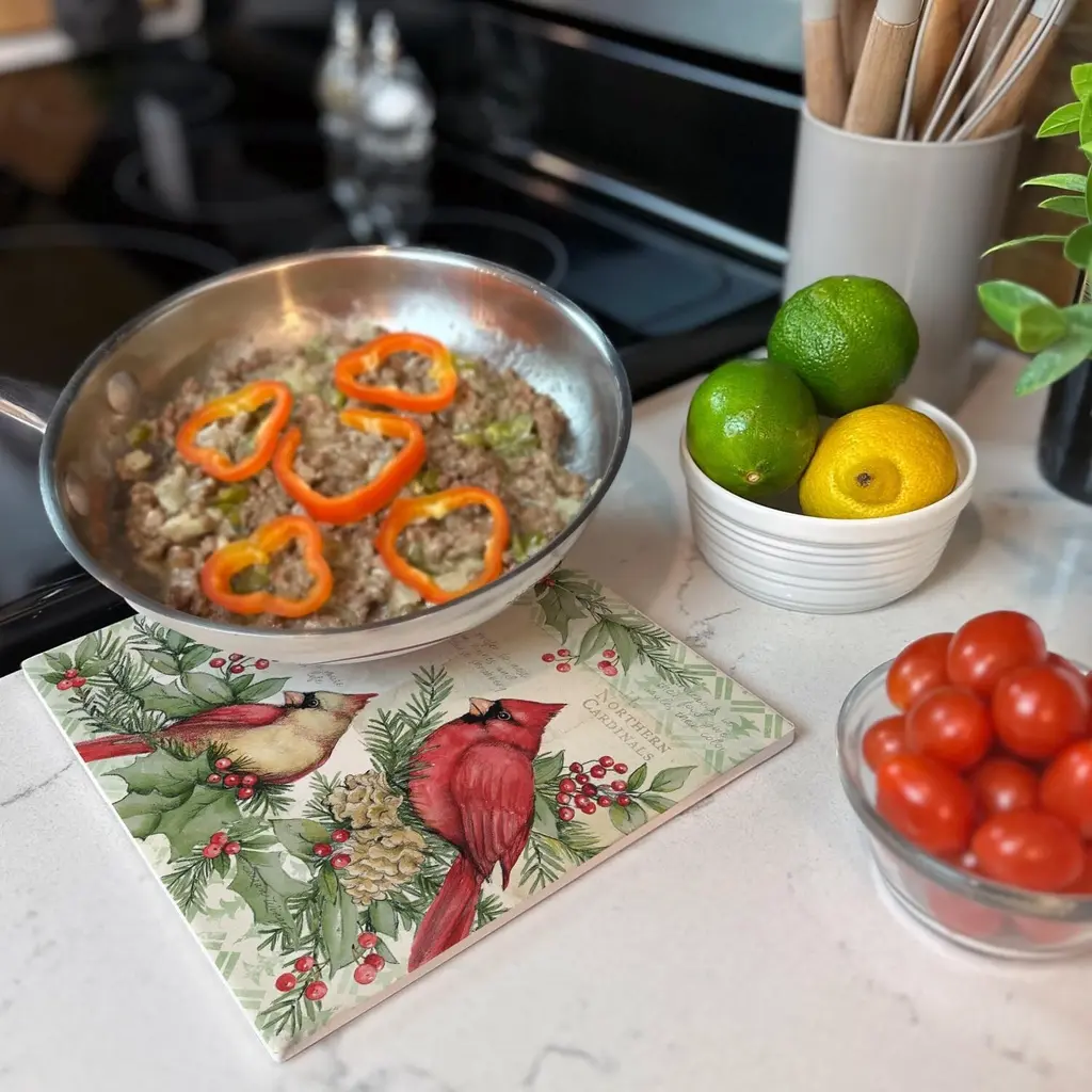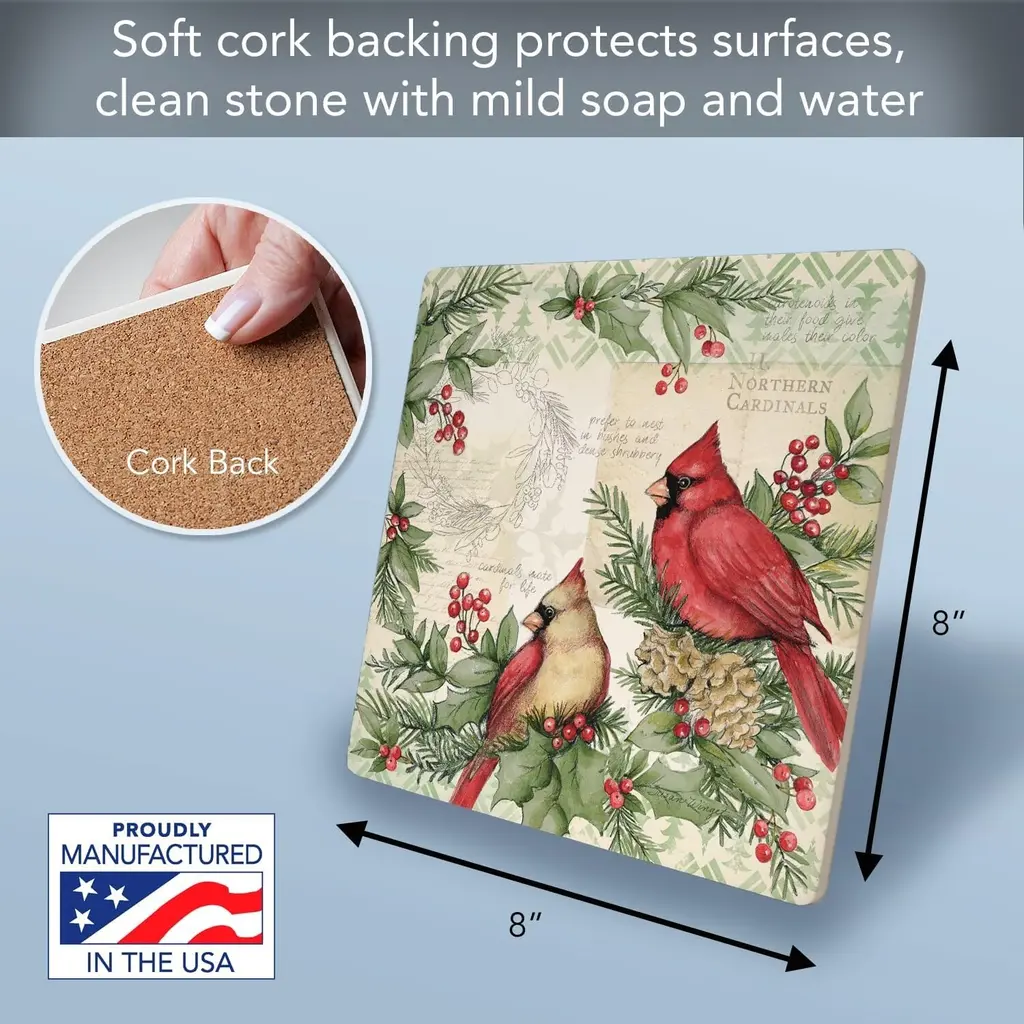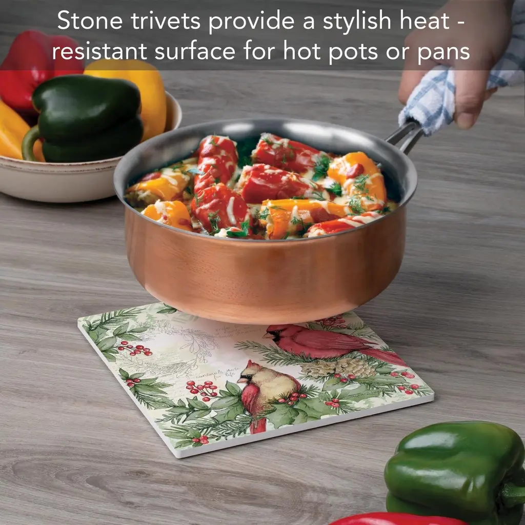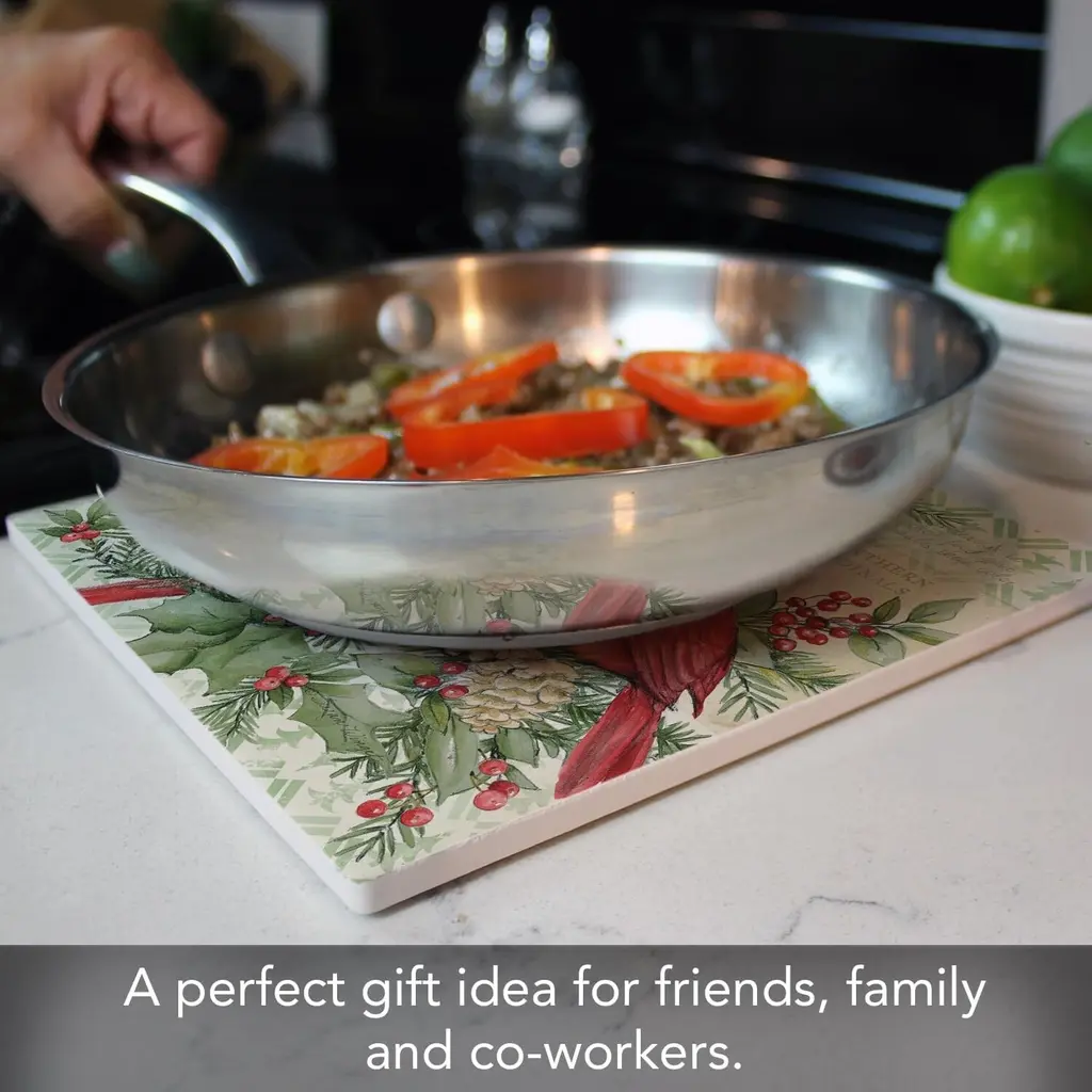 Holiday Cardinal Decorative Heat Tolerant Ceramic Stone Trivet. Trivets work great to protect your surfaces and countertops from heat damage, scratches, and stains. Each Trivet measures 8” Square allowing for different sized pots and pans to be placed on them. Protect your beautiful countertops and tables from damage with these decorative trivets. Artistic design allows the Trivet to remain displayed even when not in use. Makes a wonderful housewarming, birthday, or Mother’s Day gift.