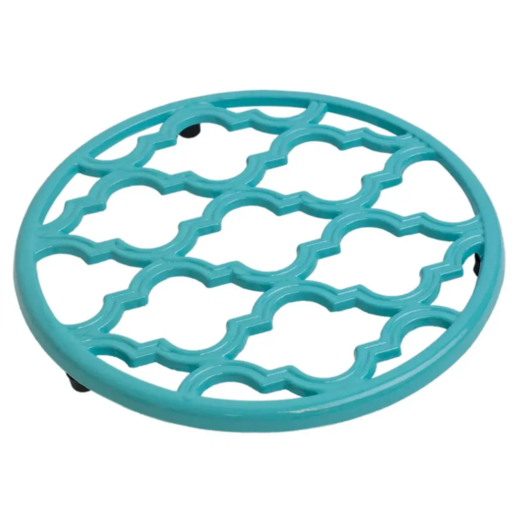 Fashion meets function with the Home Basics Moroccan Lattice Collection Cast Iron Trivet. Add this beautifully designed cast iron trivet with Moroccan inspirations to your home and use it to rest hot pots, pans and bowls. The heavy weight cast iron construction with its decorative metal work is rusts resistant and very durable. The non-skid weighted base keeps the trivet in place on the table surface to prevent accidental falls and messes. Care Instructions: Hand wash only. COLOR: Turquoise. DIMENSIONS: 8x8x.5 Inches.