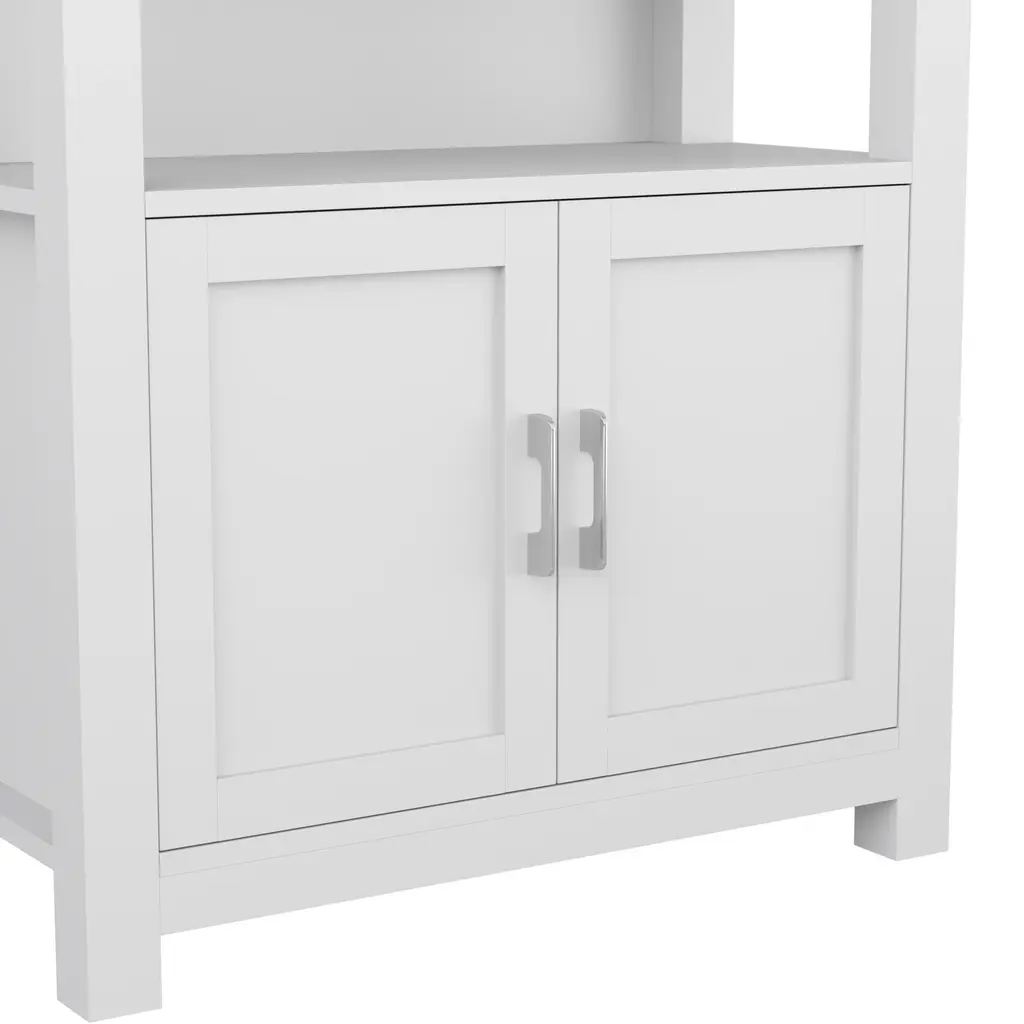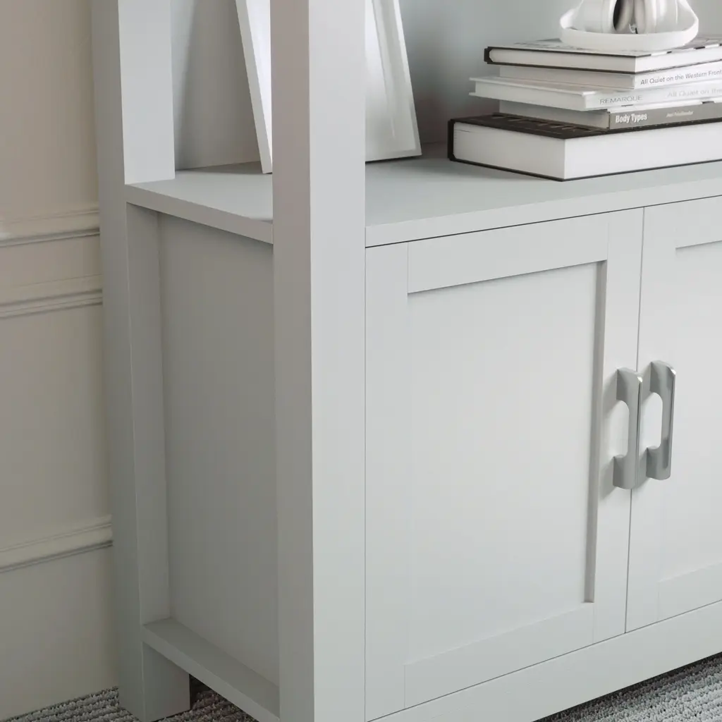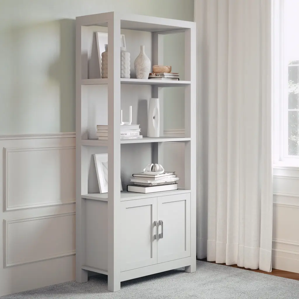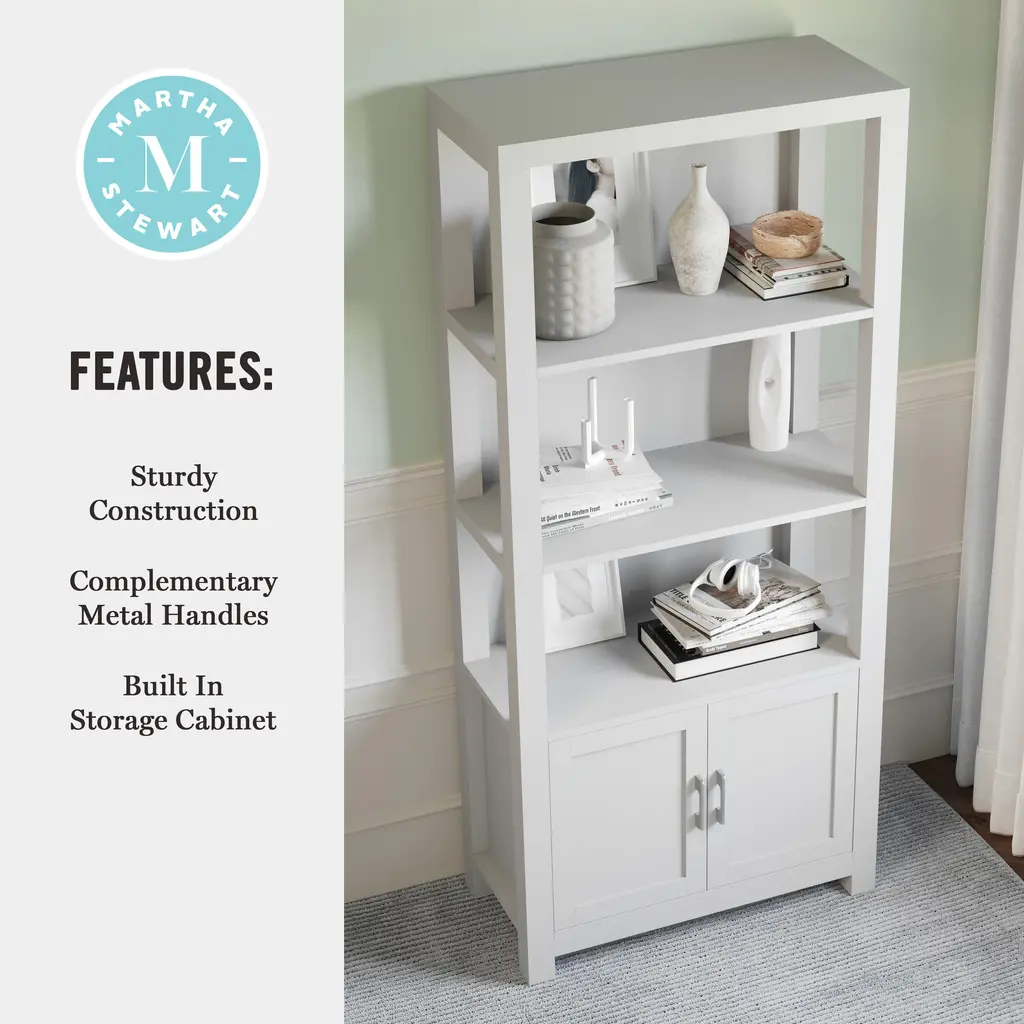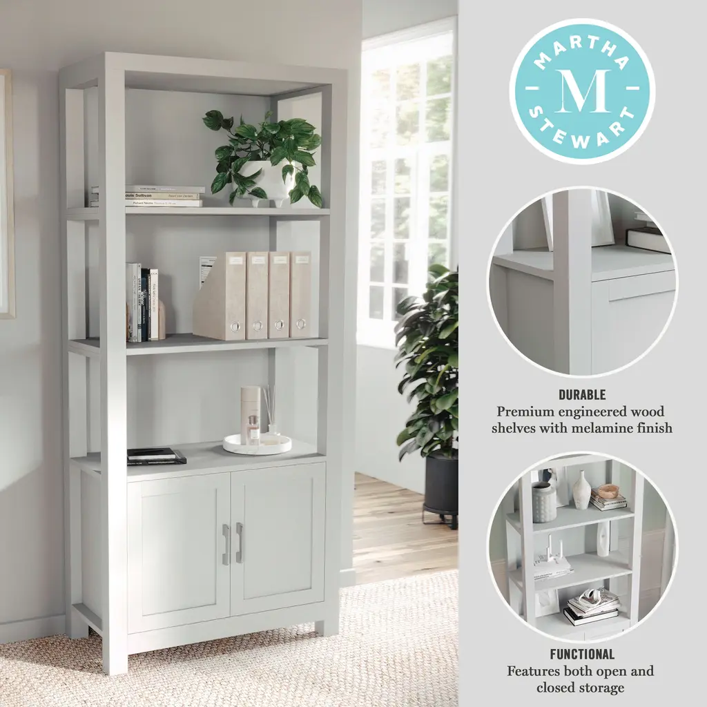 The Martha Stewart Hutton Bookcase adds timeless elegance and functional storage to your home office. The trend-forward finish and complementary hardware elevate the look of your decor with subtle style. Ample storage is provided with a versatile four-tier design and integrated storage cabinet for keeping your work surfaces orderly and clutter-free. Pair with the Hutton Desk for a total home office refresh. Assembly is easy with the included tools and step-by-step instructions.