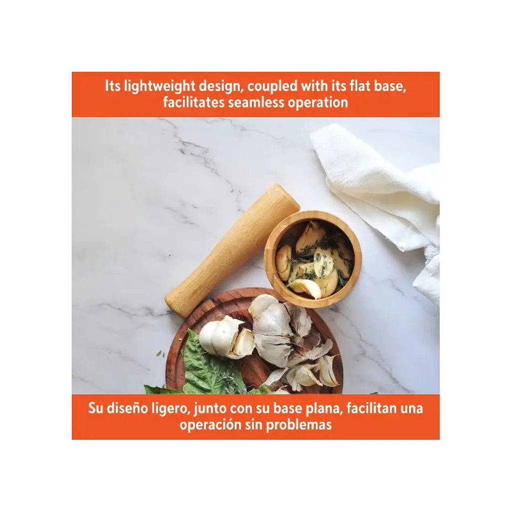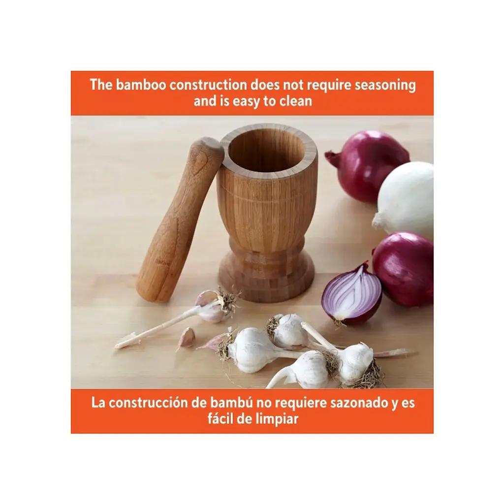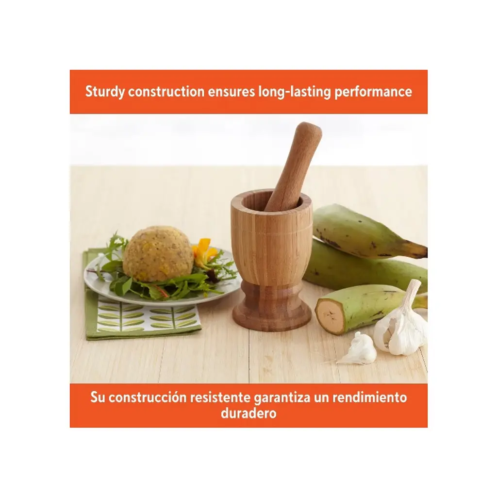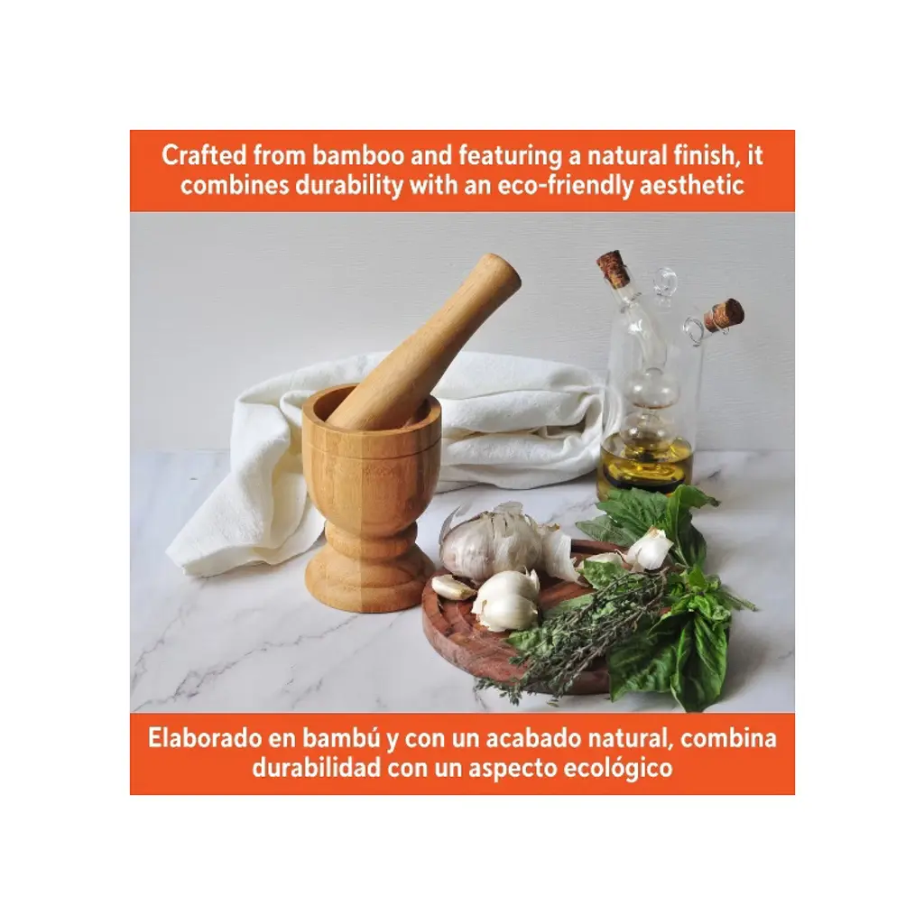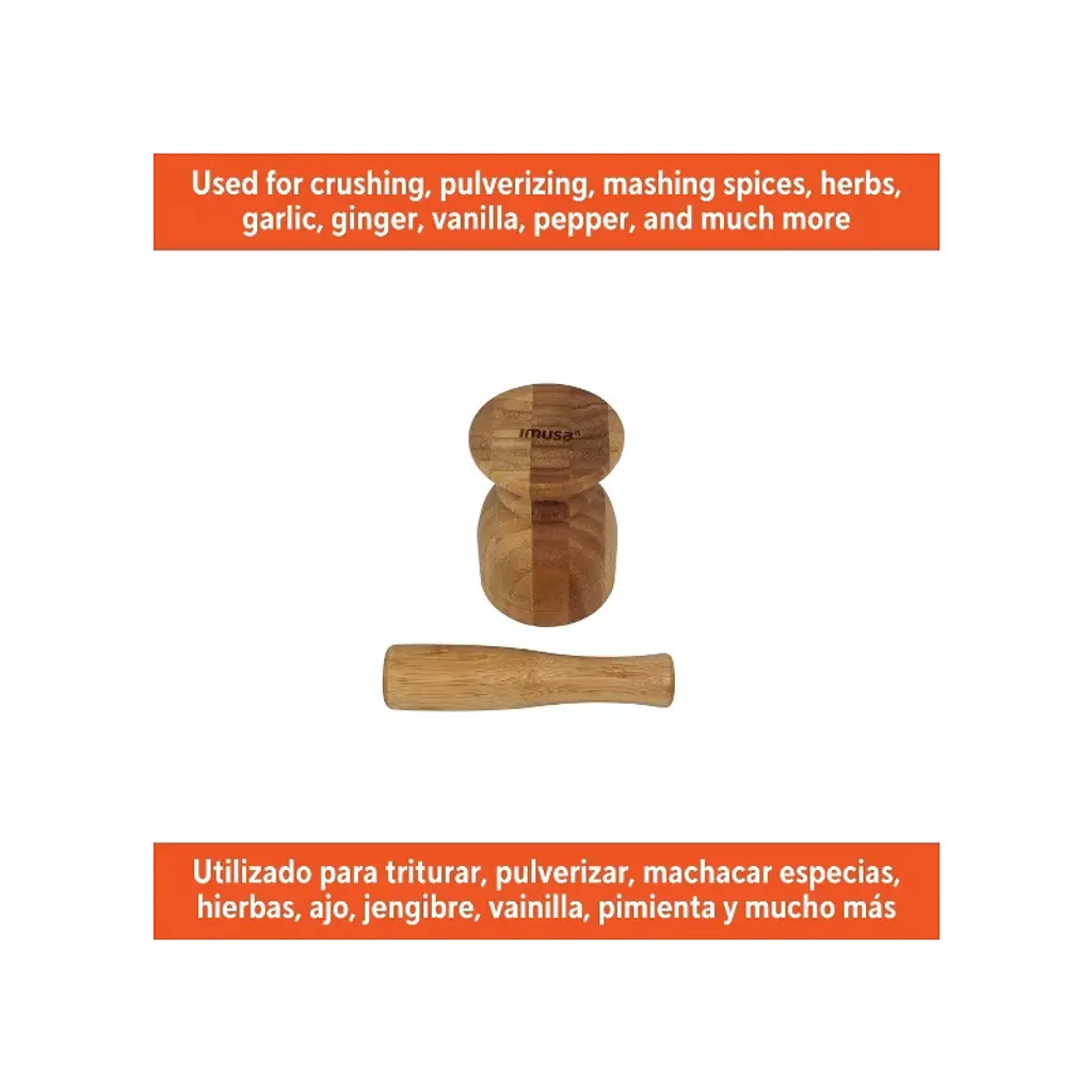 The IMUSA Small Bamboo Mortar and Pestle is an essential piece in any kitchen. Crafted from bamboo with a natural finish, this Mortar is perfect to simplify your everyday kitchen tasks. This versatile tool is easy to clean, sturdy, and exceptionally durable, making it ideal for elevating the flavors in all types of recipes and providing a heightened taste that comes from the freshness and precision of hand-ground ingredients. The lightweight design of the IMUSA Bamboo Mortar, coupled with a flat base, ensures effortless operation as you crush, pulverize, and mash a variety of spices, herbs, garlic, ginger, vanilla, pepper, and more. Embrace the simplicity of the IMUSA Bamboo Mortar and Pestle and trust it for balanced, home-cooked meals. It will surely become your kitchen's beloved companion, uniting tradition, and innovation in every delectable creation and elevating your culinary experience.