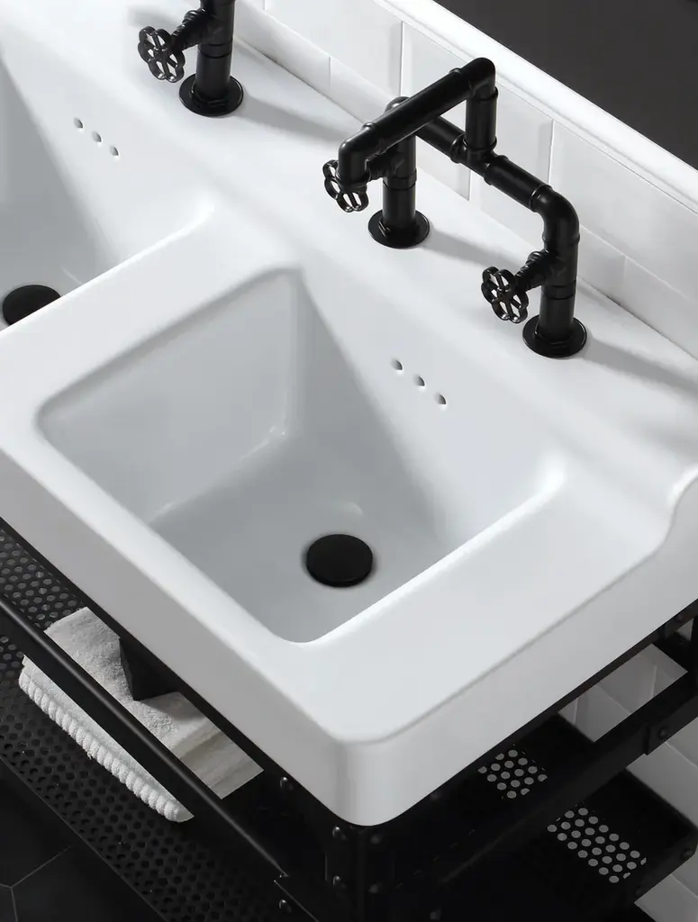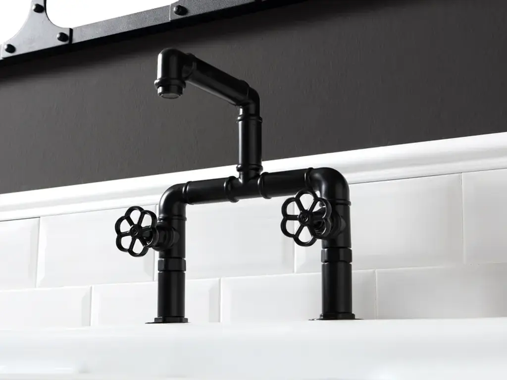 Industrialis is a industrial style washbasin tap 2 holes.Collection of washbasins and sanitary ware in a pure industrial style. Many choices of sinks (countertop or on a metal stand with a reel eiffel tower look). The Industrialis series exists with many different faucets and with several mirrors and accessories all in industrial style. Many finishes available for metal parts as well as wooden and metal furniture for additional storage. Floor mounted toilets and bidets and wall hung wc also available.