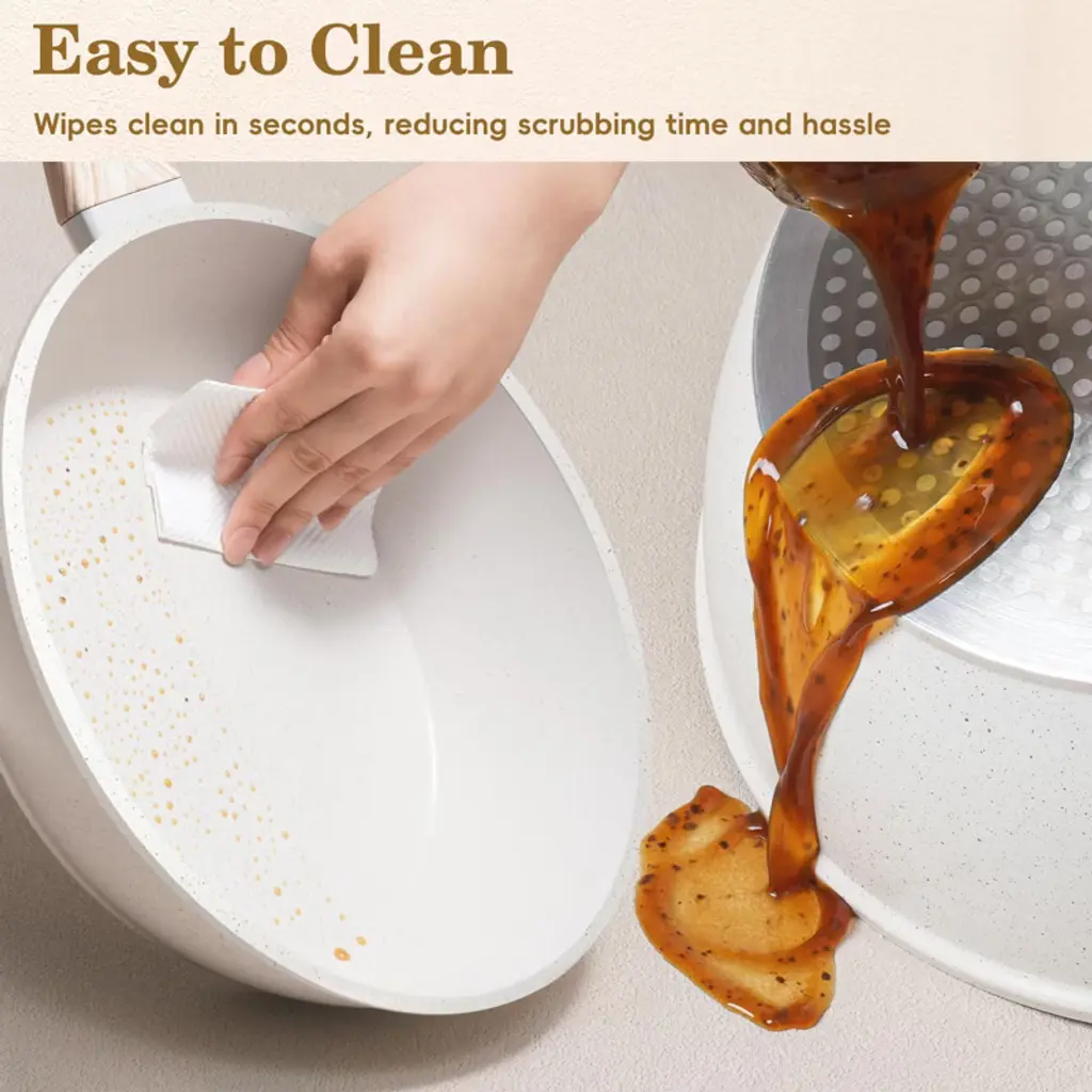 Discover this 12-piece pots and pans set, a must - have for your kitchen. Crafted from premium die - cast aluminum, it offers excellent heat distribution, ensuring your food cooks evenly every time. The non - stick granite coating is free from harmful chemicals like PFOS, PFOA, lead, and cadmium, making it a safe choice for healthy cooking. This all - in - one set includes frying pans, saute pans, casseroles, and milk pots, covering all your daily cooking needs. It's incredibly easy to clean; just wipe with a sponge or rinse under water. Compatible with all stovetops, including gas, electric, ceramic, glass, and induction, it's versatile for any kitchen. The ergonomic, heat - resistant handles provide a comfortable grip, and the tempered glass lids lock in moisture and flavors. Simplify your cooking process and enjoy healthier, hassle - free meals with this amazing cookware set.