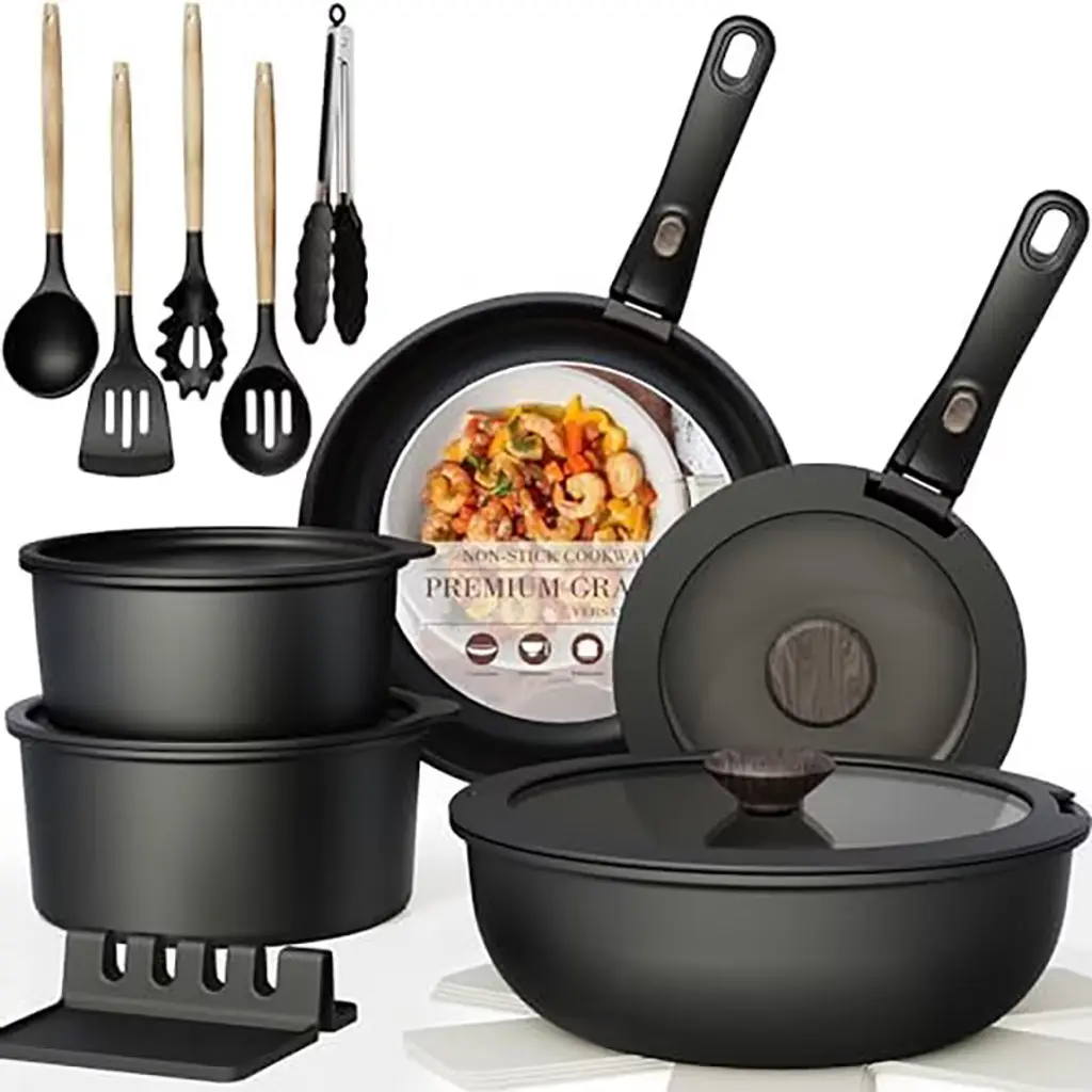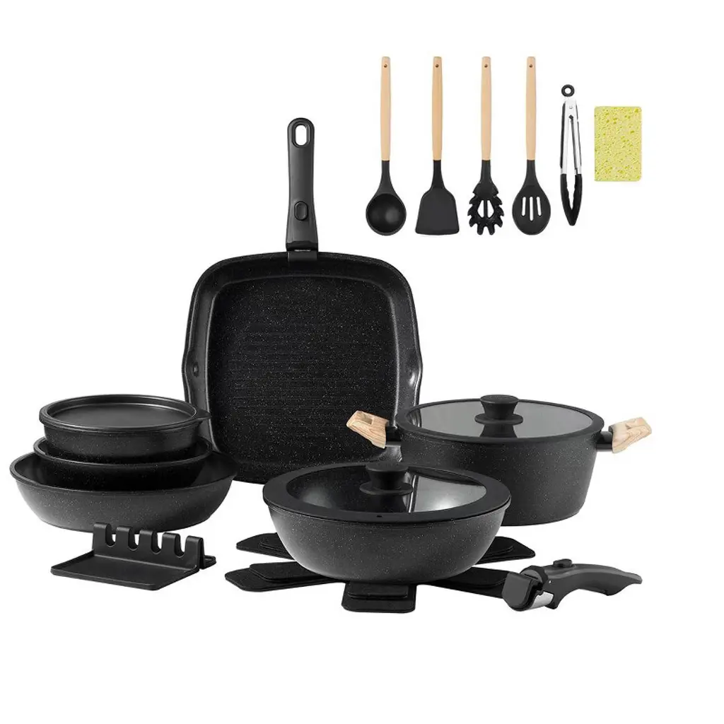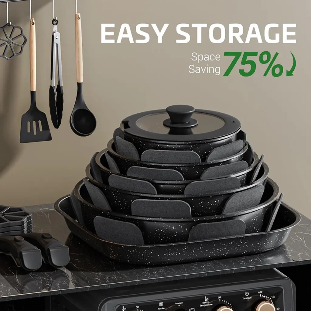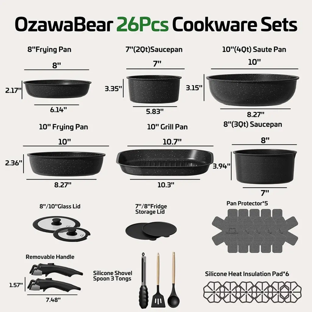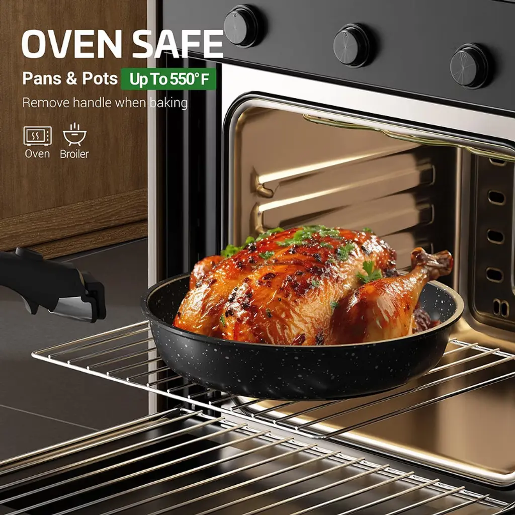 Itopfox 26 Pcs Non Stick Ceramic Cookware Set With Detachable Handles, Oven Safe Induction Cookware For Rv Kitchen, Pfas Pfoa & Ptfe Free, Black