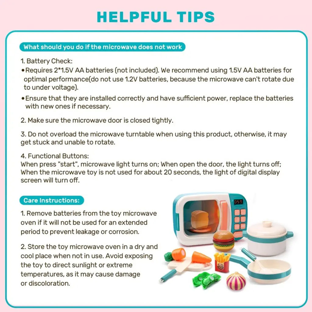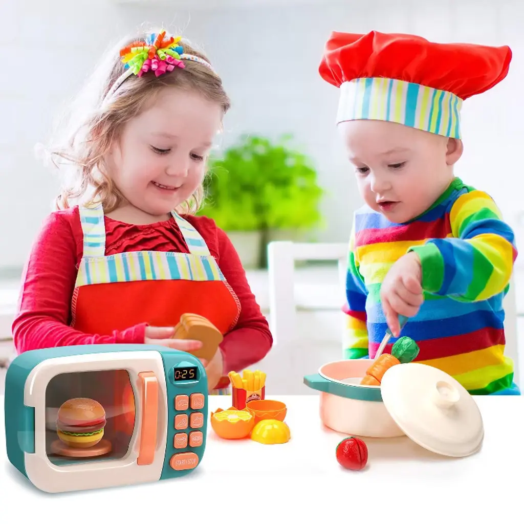 Discover this amazing microwave toy kitchen play set! It's a great option for kids' pretend play. Made from high - quality ABS materials, it's safe for toddlers and preschoolers. The set includes an electronic microwave that lights up and makes realistic sounds, 8 cutting play food pieces, cookware, utensils, knives, and a chopping board. The microwave plate spins, and it has a working timer with 6 different functions. This toy encourages children to play chef, cook with parents or friends, which helps develop problem - solving skills, social interaction, and imaginative play. It's perfect for playtime, role - playing, and educational activities. It makes a wonderful gift for birthdays, holidays, or special occasions. Just remember not to overload the microwave turntable during use to ensure smooth operation and provide hours of endless fun for your little ones.