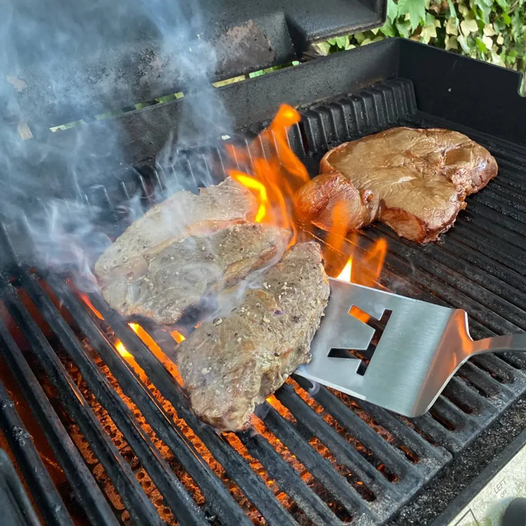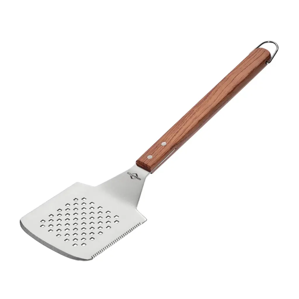 The accustomed griller will be primed to barbecue with this premium quality Acacia wood handled stainless steel spatula by Outset. The Jackson spatula features an ergonomic Acacia wood handle which conducts heat slowly and provides optimal comfort and control. The heavy duty stainless steel metal construction harnesses impeccable durability, all while keeping the griller away from the BBQ grill heat whilst cooking. The elegant design of the extra thick handle provides a comfortable grip for easy use when flipping burgers, steaks, chicken, and more. A convenient hanging loop on the handle allows you to keep your grilling tool within reach. Pair it with Outset Jackson Tongs for a deluxe tool set sure to impress!
