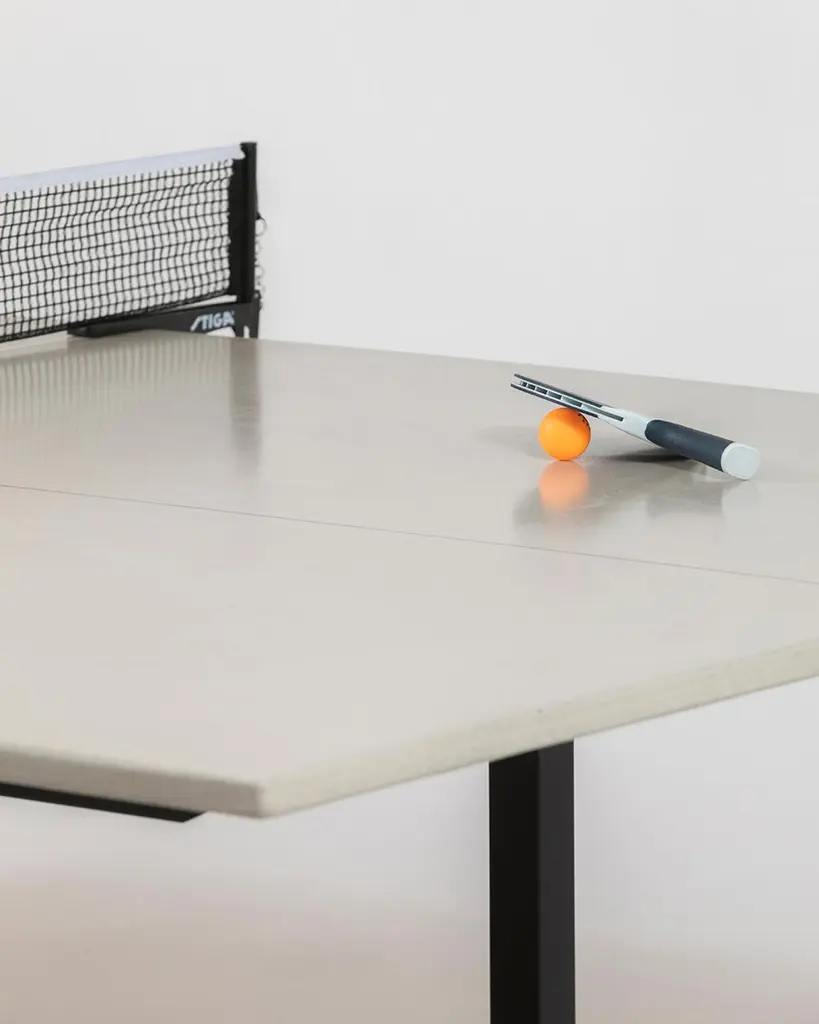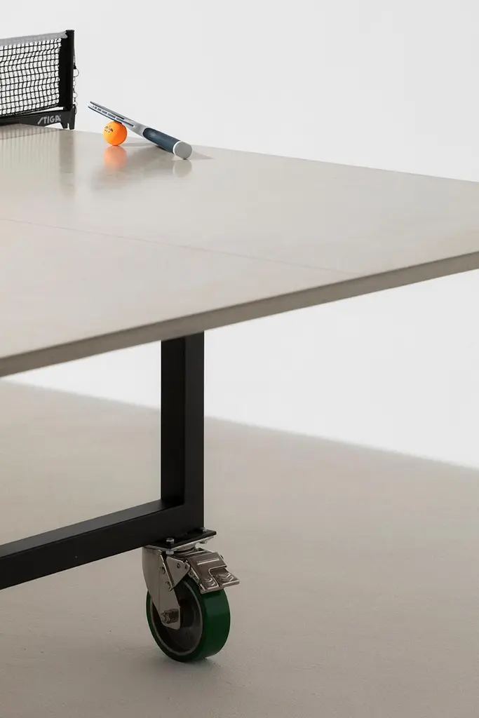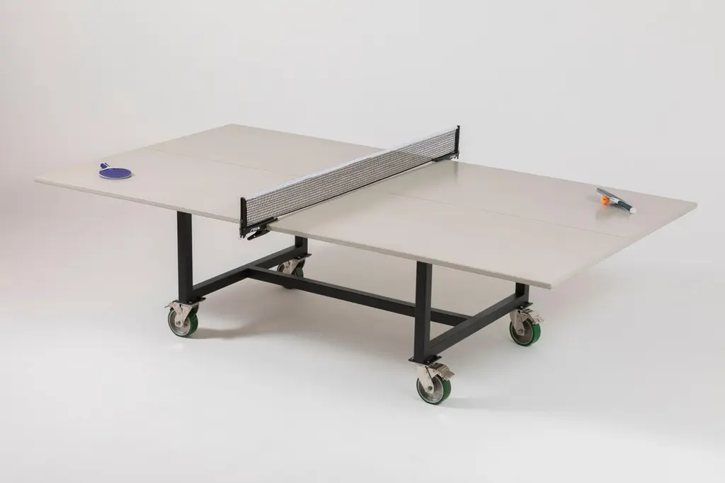 James de Wulf's latest Rolling Ping Pong table boasts a stylish game with a slick, finished concrete playing surface atop a powder coated steel base. The redesigned classic Vue table can move about your play room and outdoor setting on rugged 6" stainless steel, locking casters. Regulation sized at 108" x 60" x 30" H, the table plays on an acid-stained center line. Finish the day of rallies as the Ping Pong table doubles as a dining table for epic hosting. Comes with a removable net and play accessories. Suitable for indoor and outdoor use. Compliment with a bench and dining chairs to welcome dinner guests.Shown in creamy white on black powder coated steel.Custom outdoor covers available.Table is also available in light grey, natural tone, dark grey, and black.James de Wulf has been widely recognized for his original and innovative work with concrete design and rapidly became known for his ability to fuse advanced concrete technology with aesthetic, modern, and natural concrete forms to constitute functional art.