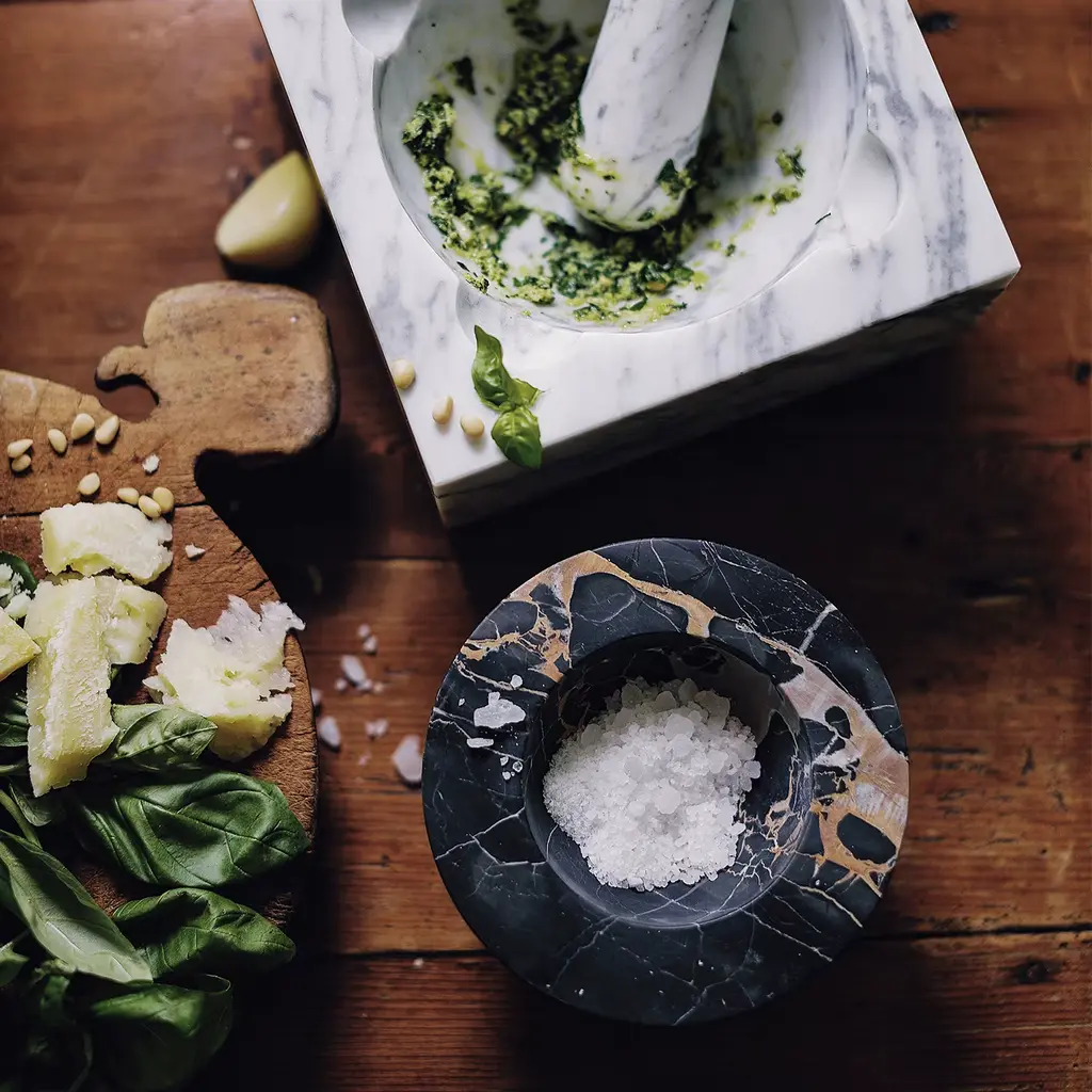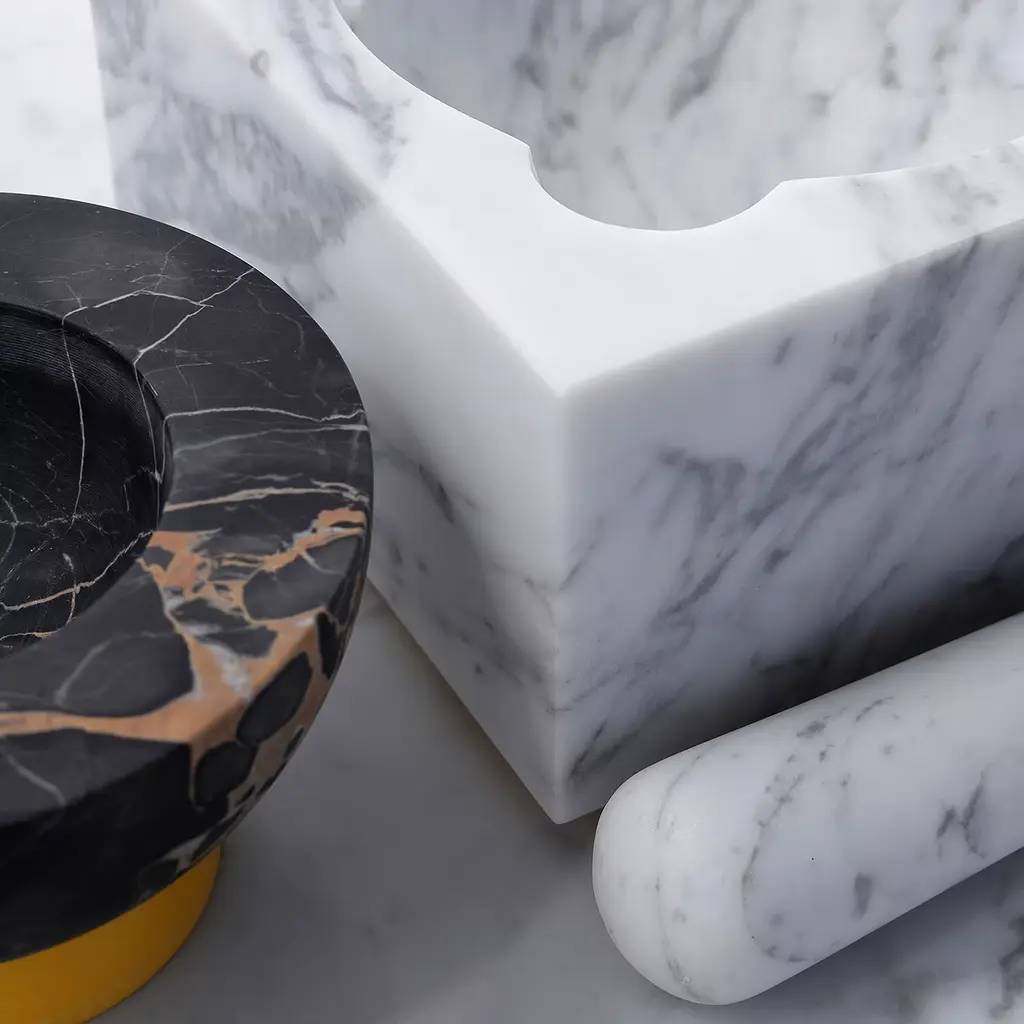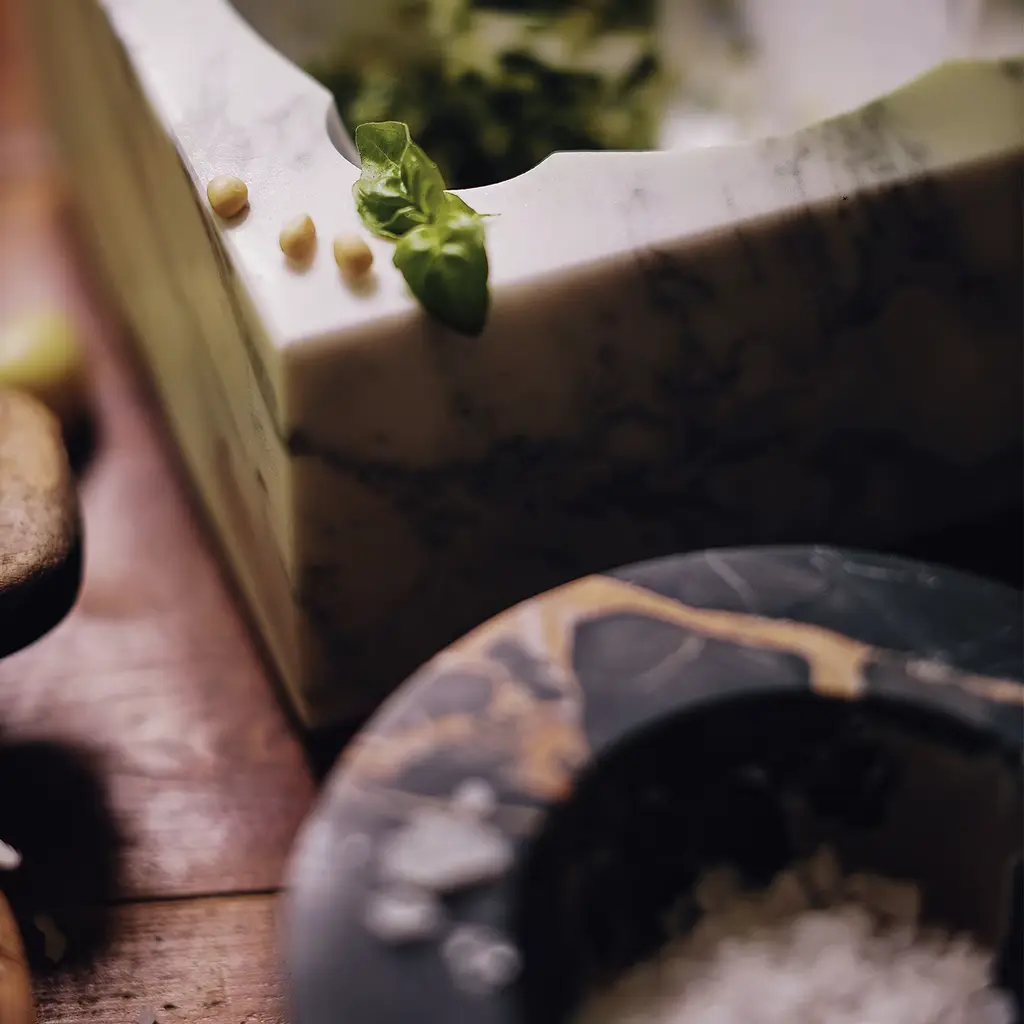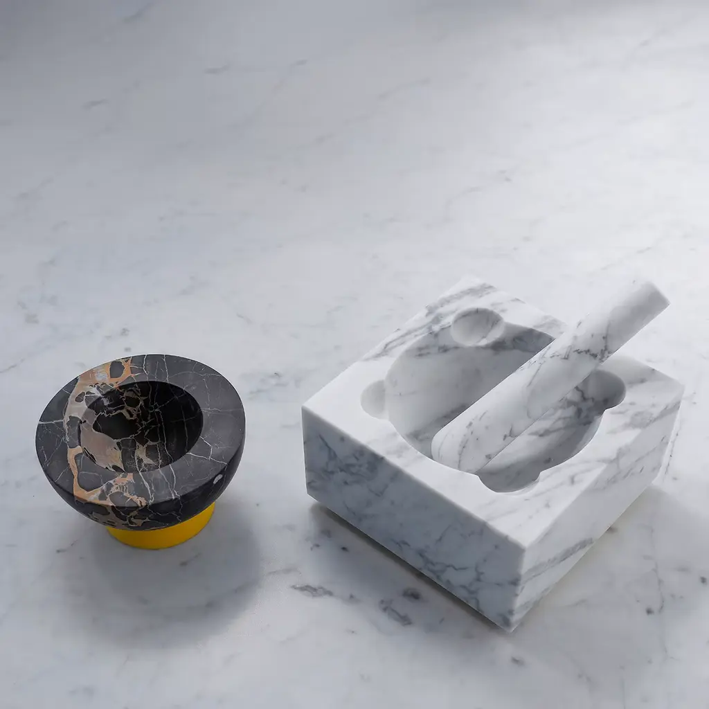 Designed by Mara Capetta, the J&J set is a modern interpretation of the classic cooking accessory traditionally used in the preparation of pesto. The set comprises 2 mortars, a large one in White Carrara marble and a small one in Portoro Vena Gold; the size of the mortar to use is determined by the ingredients to grind, whether salt and pepper to chili peppers and garlic. A superb housewarming gift, this set will be the standout piece in any kitchen.