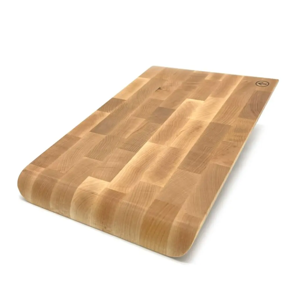 Inspired by infinity pools, this premium cutting board features elegant rounded edges that make the board easy to pick up as well as effortlessly transfer chopped foods. The maple board is constructed with end-grain wood that helps to maintain knife sharpness and lessen the appearance of cut marks.