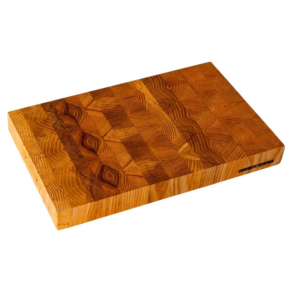 This display-worthy cutting board showcases the beauty of end-grain walnut wood. Made up of sections cut from the inner rings of a tree, the end-grain board boasts a dramatic mosaic of deep wood tones with warm highlights. The construction method is prized by professional chefs as it helps maintain the sharpness of knives. Standing up to everyday slicing and chopping, the board doubles as a serving piece for cheese, charcuterie or crudites.Offering fine New England craftsmanship, Vermont-based J.K. Adams has been creating housewares since 1945.