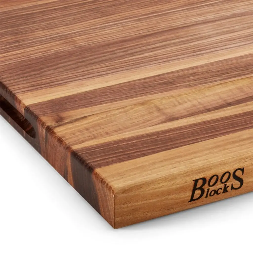 This beautiful cutting board is crafted out of black walnut by the revered woodworkers at John Boos, founded in 1887. The reversible board's edge-grain construction ensures uniform thickness and an even cutting surface. What's more the wood fibers absorb impact of cutting blades, allowing knives to stay sharper and the board smoother. Integrated hand grips make for a clean, streamlined look.View all John Boos products