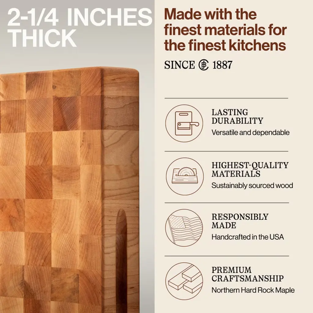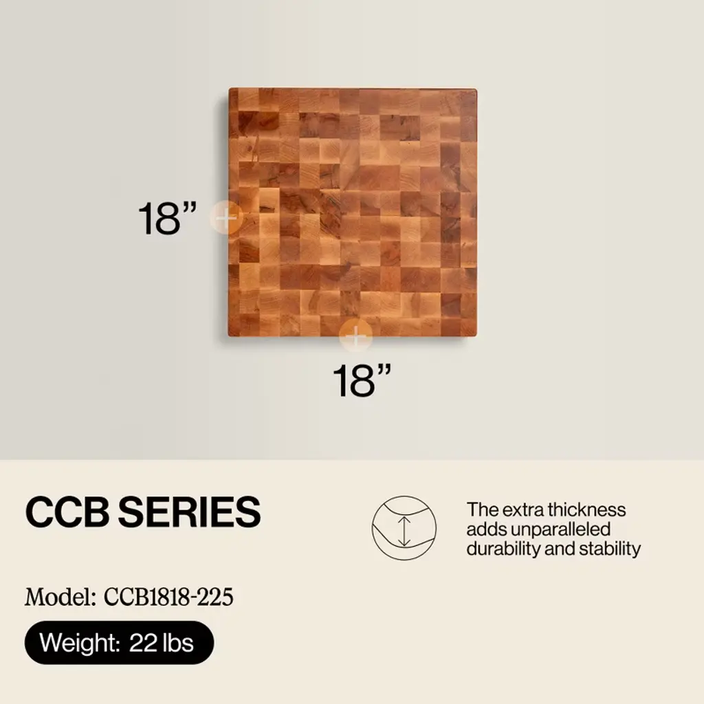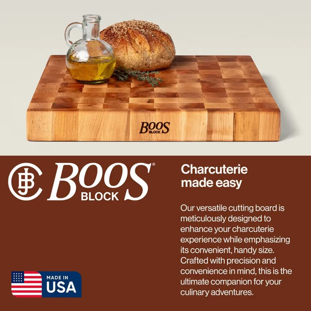 Made in our home and crafted for yours, the John Boos CCB series reversible wood chopping block is a kitchen essential designed for efficient food preparation. Crafted from high-quality wood with an end-grain design, this chopping board offers ample space and durability for chopping meats, greens, and more. Its flat side is great for cutting, carving, and chopping bread, veggies, and other ingredients, and the recessed finger grips ensure easy mobility and handling. This expertly crafted tool features an oil finish that enhances the natural beauty of the wood board while offering added protection against moisture and daily wear. Maintain the bevel, sand minor scratches, and follow simple maintenance solutions found in our kitchen cutting board care and usage sheet to ensure longevity and optimal performance. For additional care, we recommend using our Boos Block Mystery Oil and Board Cream (sold separately) to revitalize and protect the wood fibers and wooden surface. Since 1887, John Boos & Co. products have been the choice for renowned chefs and restaurateurs worldwide. Through a legacy of workmanship, innovation, and devotion stemming from our founder to employees past and present, John Boos & Co. aspires to be recognized worldwide as a touchstone at the heart of cooking and the enjoyment of food.